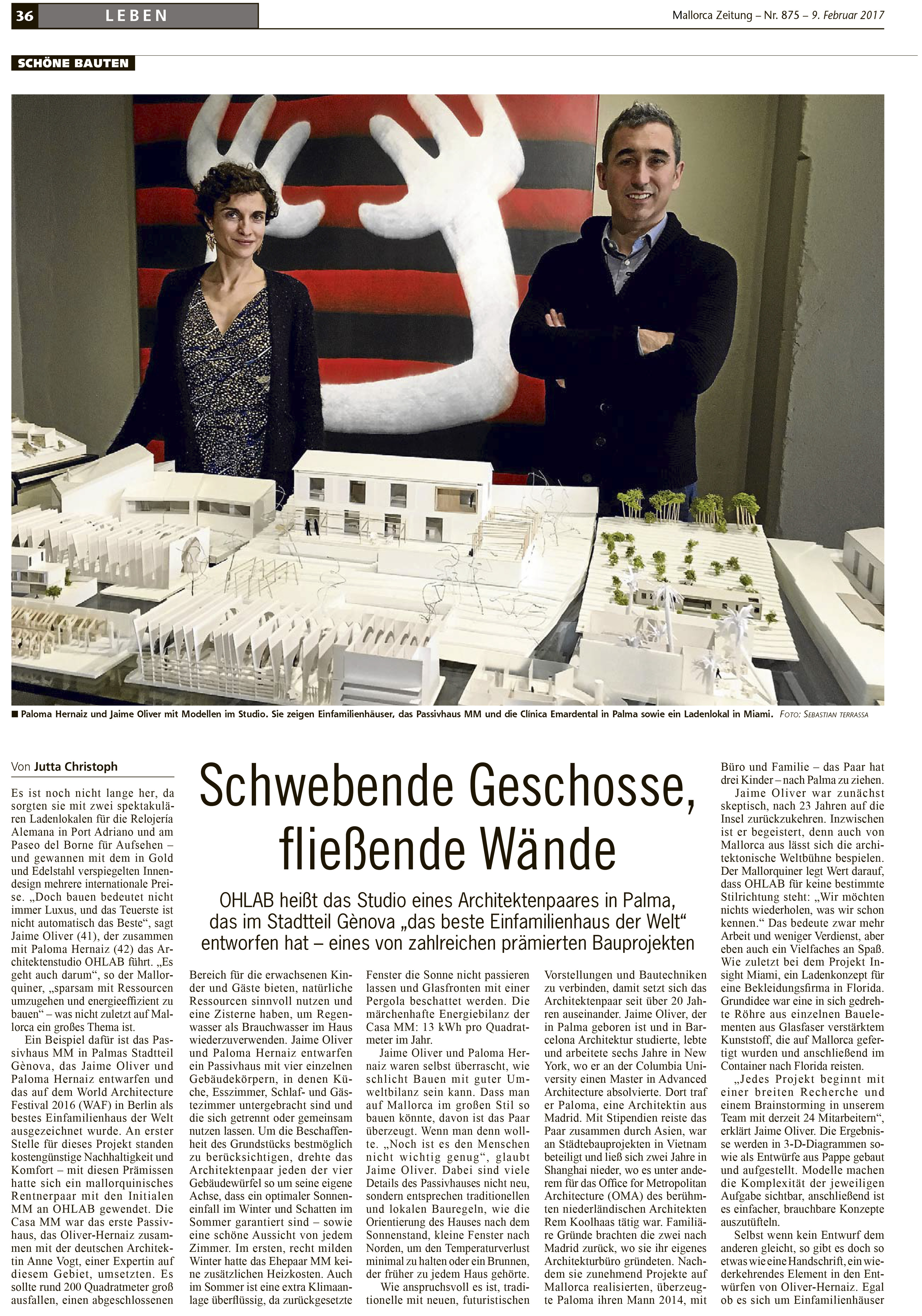 OHLABMALLORCA ZEITUNG Publications / February 2017 Flying floorplans, fluid walls. It is the tittle of the interview made to Jaime and Paloma, OHLab, by Mallorca Zeitung newspaper. MALLORCA ZEITUNGMonday, February 13, 2017Admin Ohlab 0 PublicationsBACK