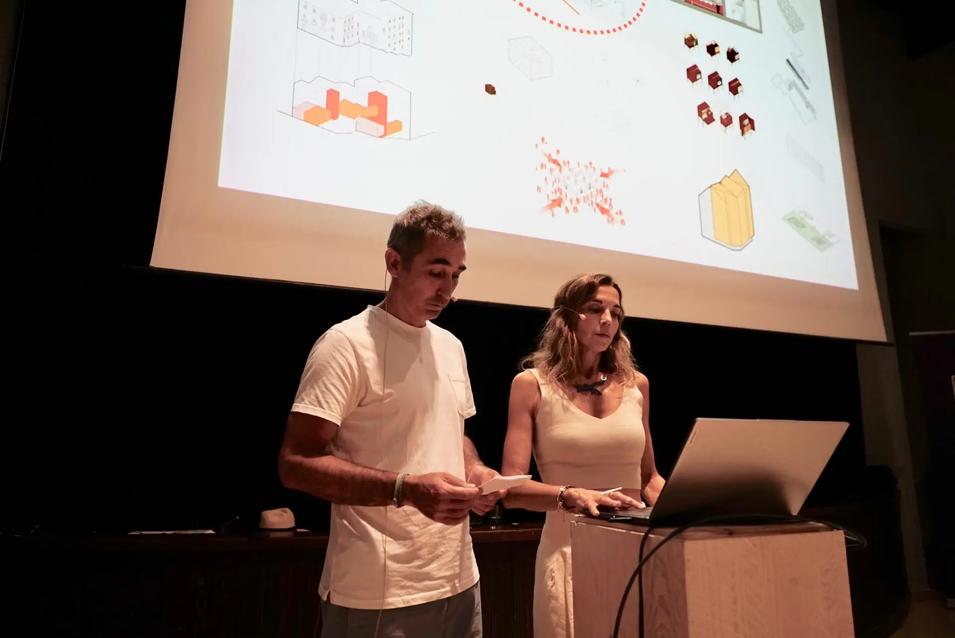 Paloma Hernaiz y Jaime Oliver, directores del estudio de arquitectura OHLAB, presentaron diversos proyectos construidos que posibilitan el acceso a agua potable a través de los recursos de captación y aprovechamiento de las propias viviendas, autorregulación climática a través de la humedad, selección de especies vegetales y paisajismo optimizado.