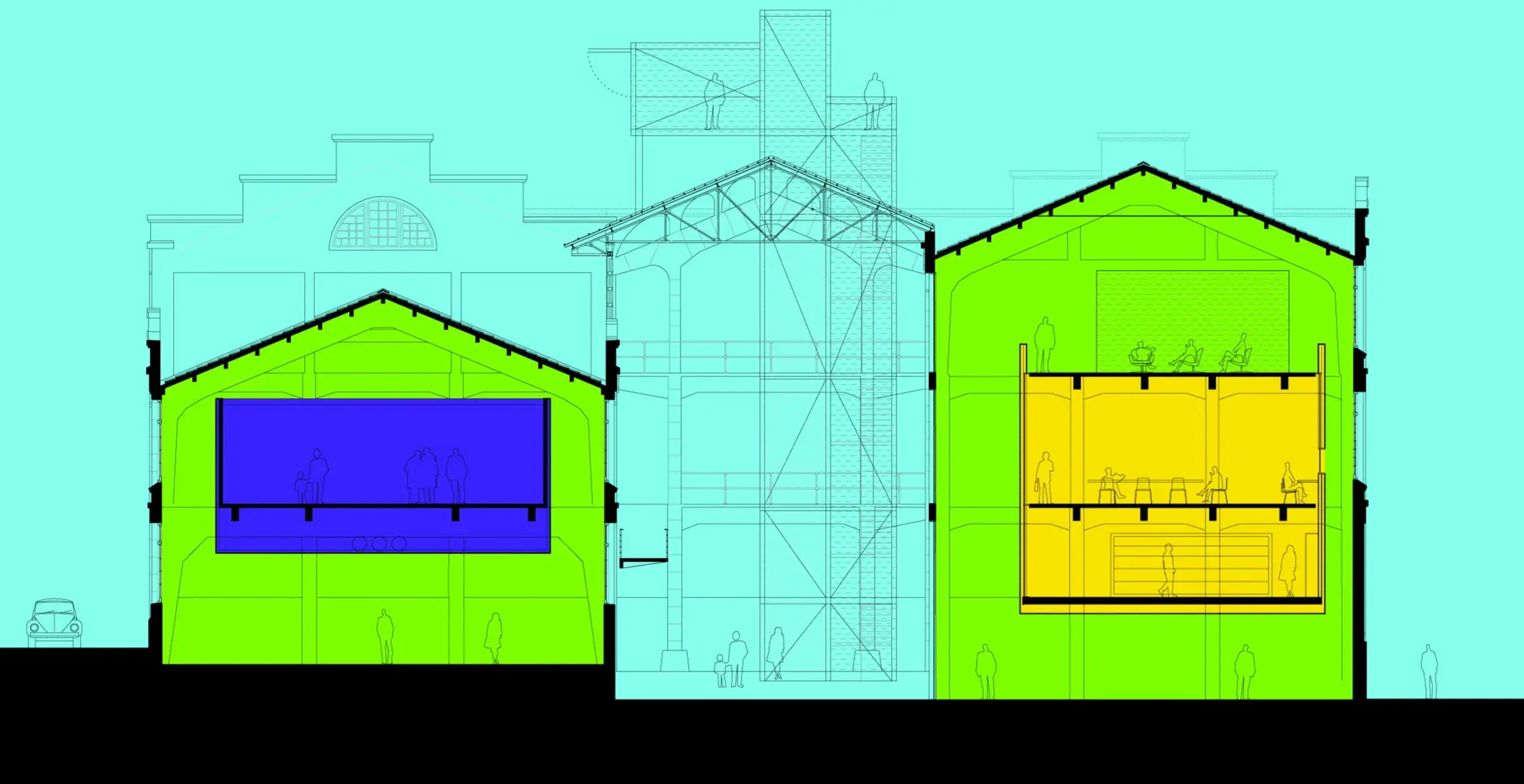 Se respeta y enfatiza el edificio existente como pieza clave para la generación de escenarios múltiples. Vaciamos el edificio manteniendo el envoltorio y la estructura como soporte para el programa. Se aplica el principio de la conservación más que el de la reconstrucción: nos apropiamos de la poderosa imagen de decadencia del edificio y convertimos esta ruina congelada en generadora de nuevos espacios.