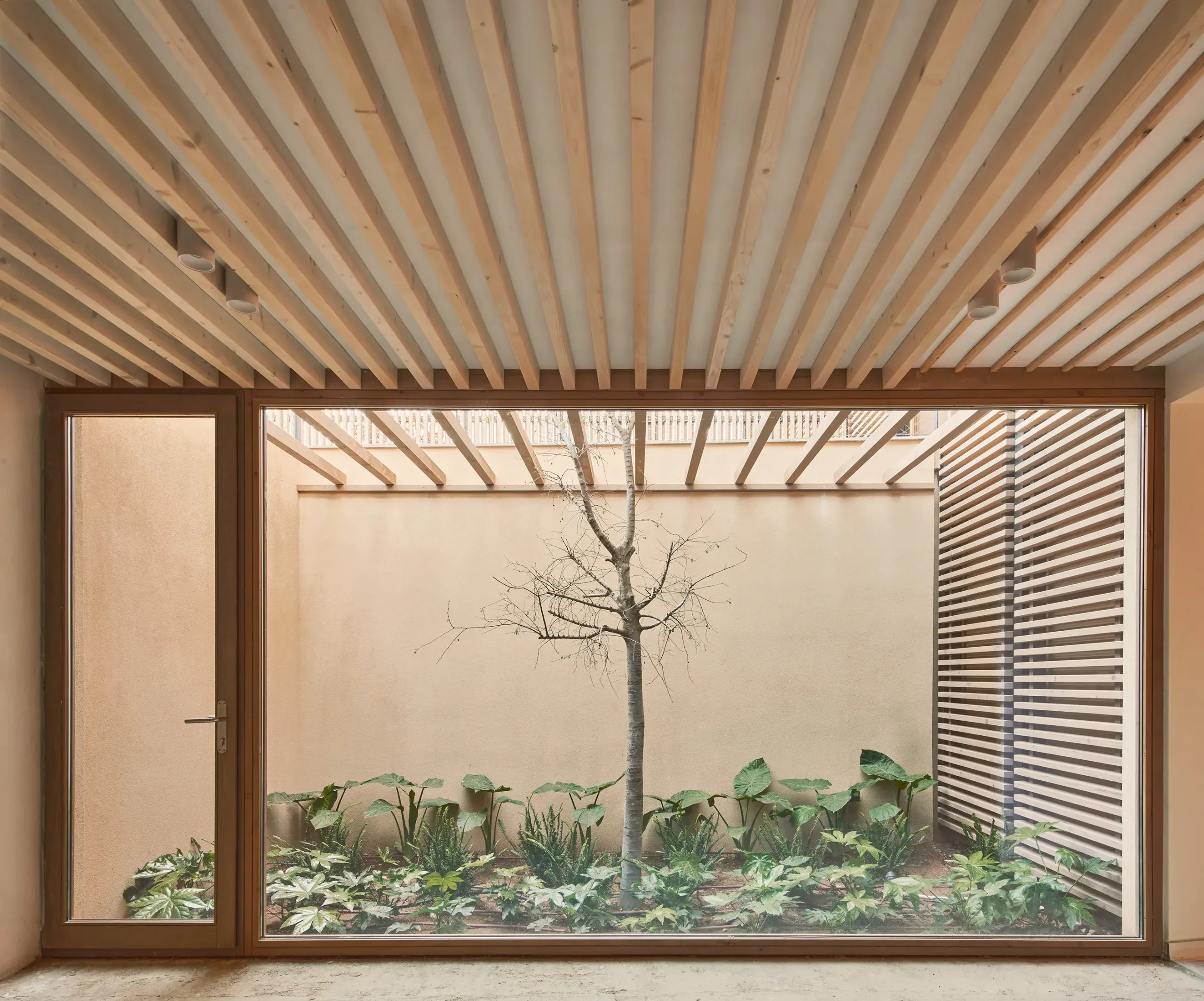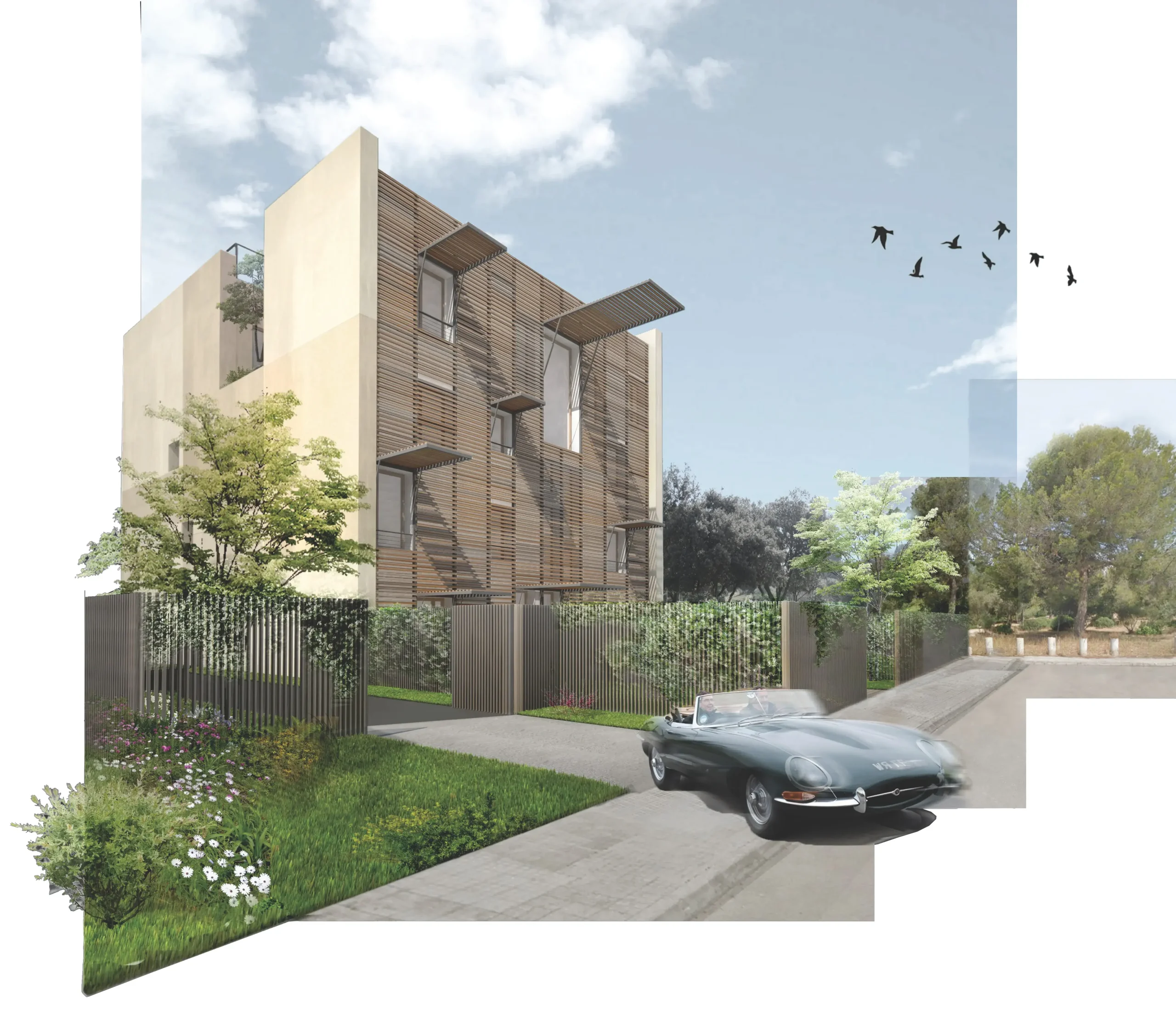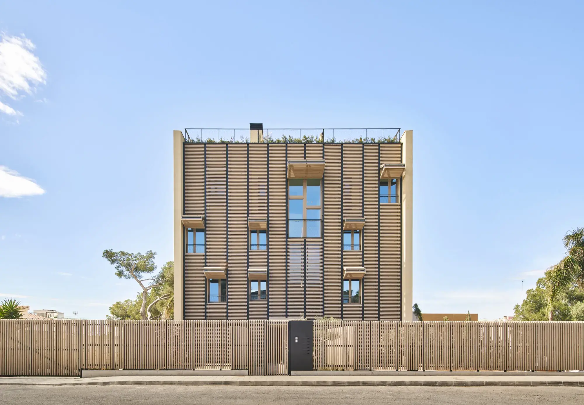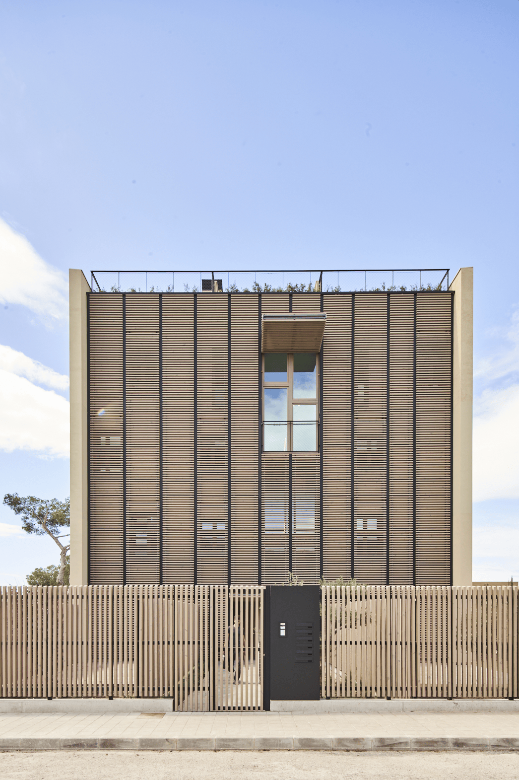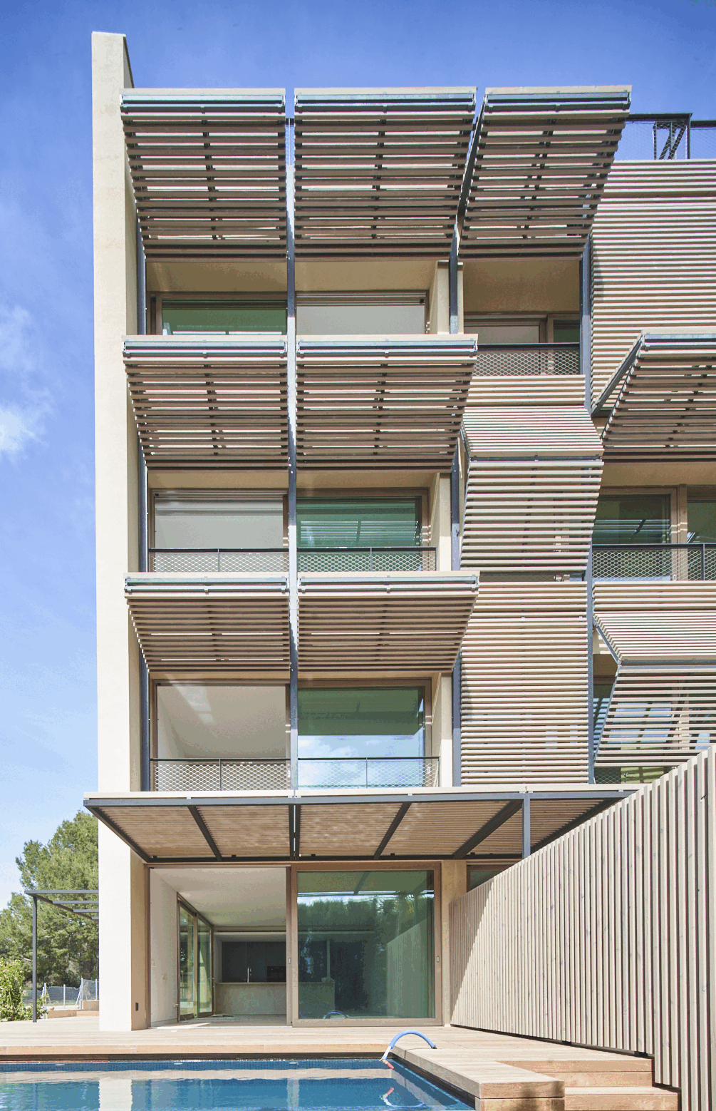 Las fachadas principales a las mejores orientaciones, vistas y jardines están formadas por persianas plegables de lamas horizontales de madera que actúan como filtro solar, creando un juego cambiante de luces y sombras inspirado en las pérgolas y celosías tradicionales mediterráneas, permitiendo regular la privacidad y controlar el aprovechamiento solar durante todo el año. Los paneles de la fachada se levantan transformándose de persianas a pérgolas según la necesidad de la vivienda, la orientación y la incidencia del sol.