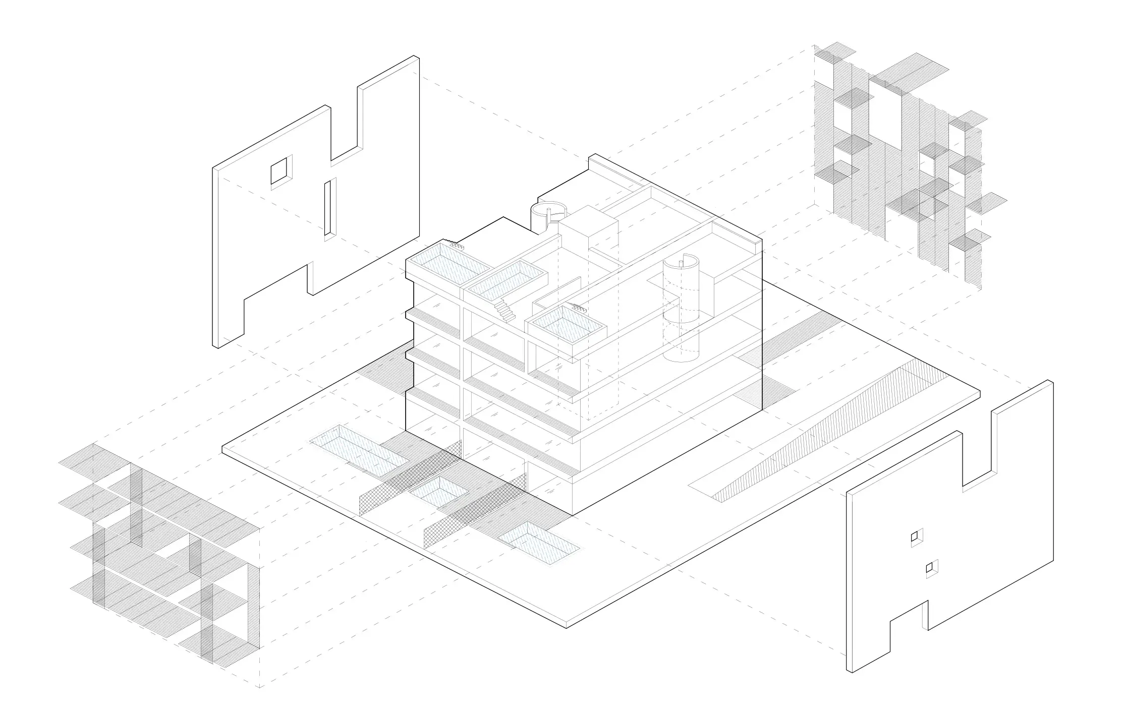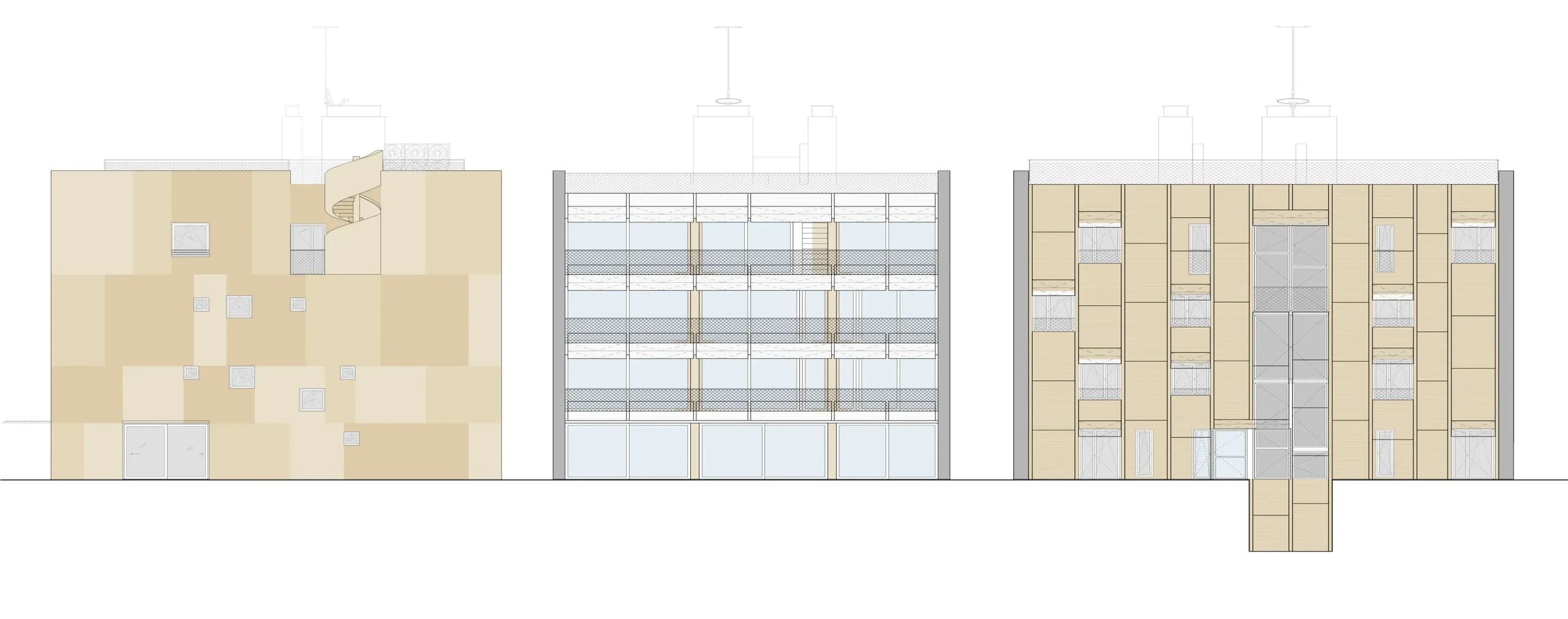 Las fachadas laterales hacia los vecinos más próximos y hacia las calles colindantes, son unas fachadas más sólidas y herméticas con huecos irregulares de diferentes tamaños según el programa que contienen. Diferentes texturas y tonos terrosos junto con la irregularidad de los huecos rompen la planeidad y regularidad de las fachadas laterales.