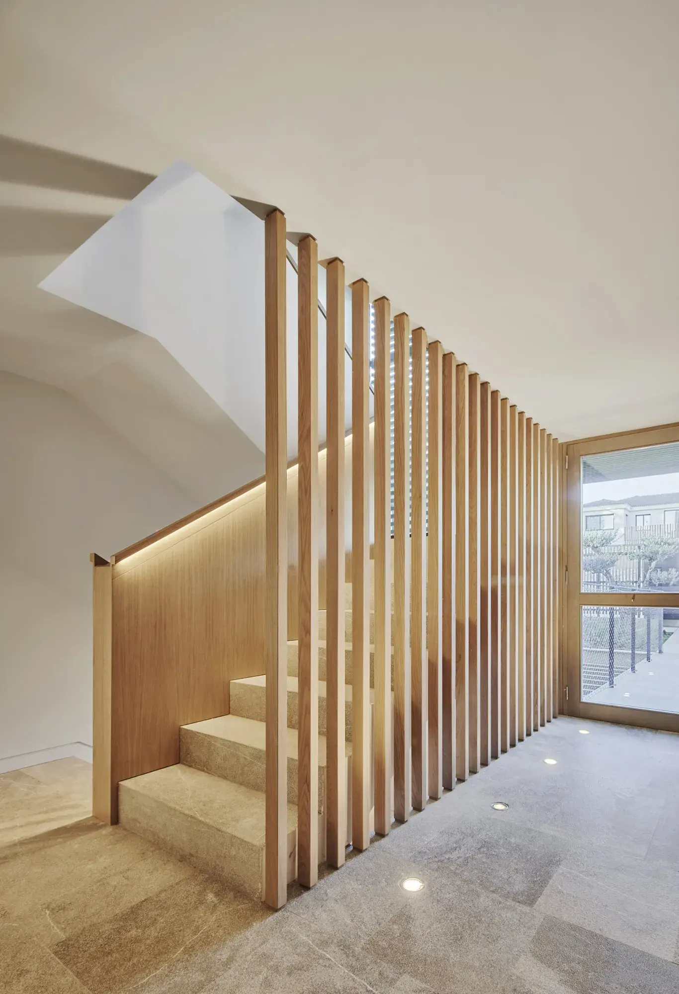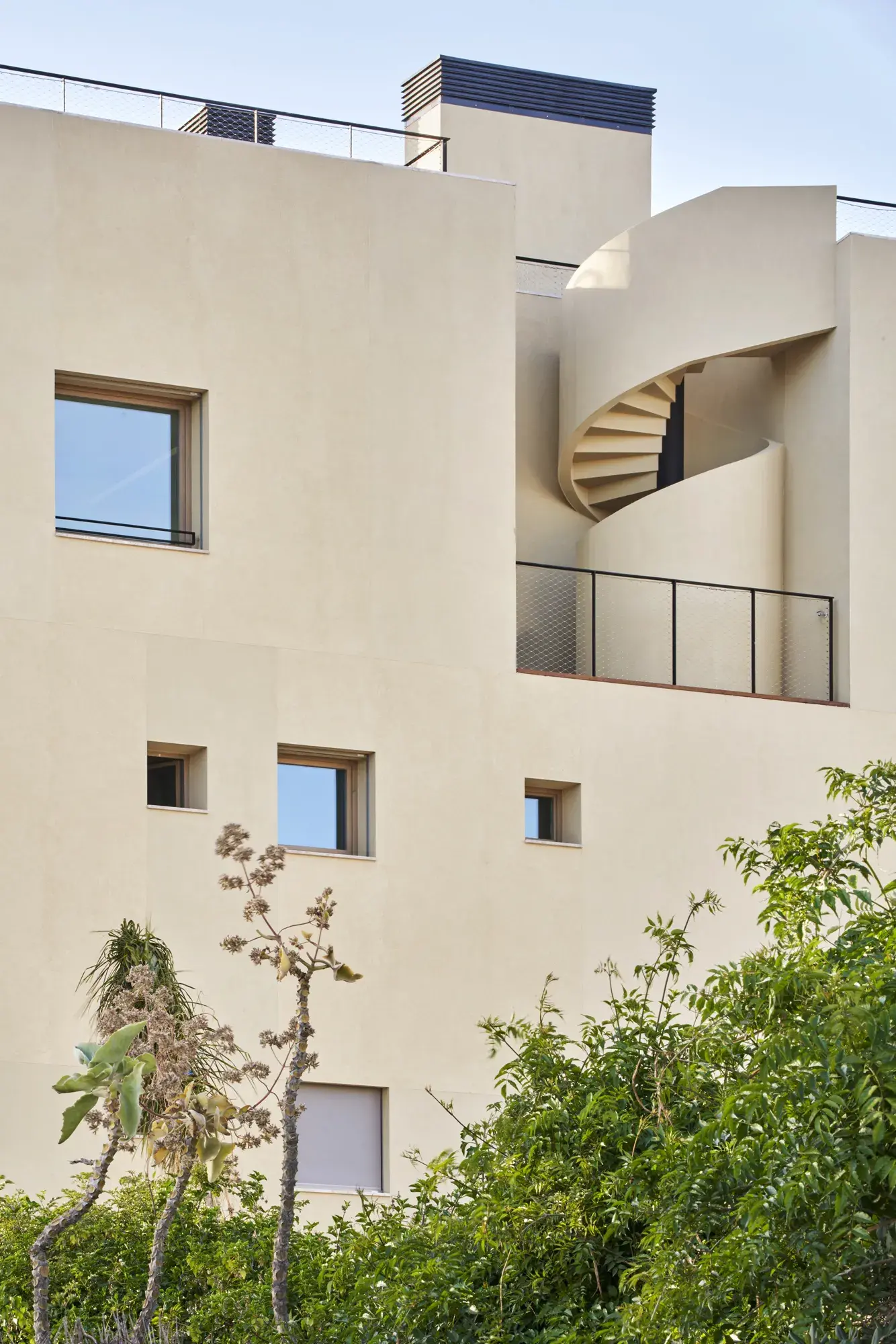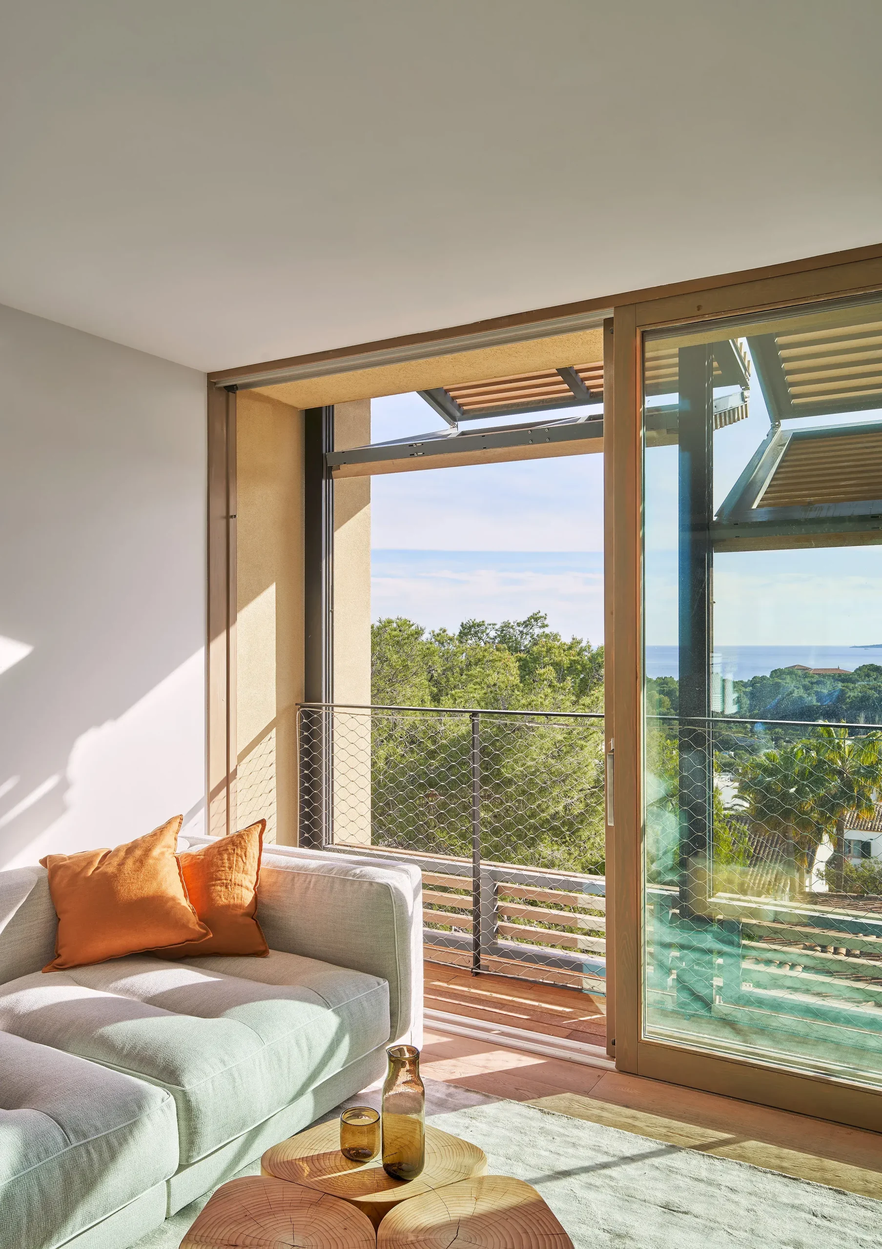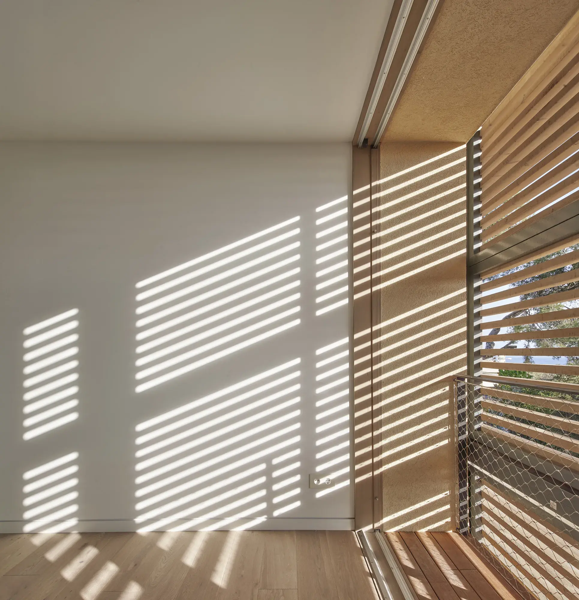 De esta forma se puede aprovechar el sol de invierno y bloquear el sol de verano funcionando como una piel cambiante, orgánica y permeable, reflejo exterior de su vida interior, un filtro solar modulador de luces y sombras, optimizado a partir de los estudios solares, que se adapta a las diferentes necesidades climatológicas y que encuentra sus raíces en la tradición de las pérgolas y persianas mallorquinas, que unido a una ventilación cruzada y un sistema de recuperación de calor es clave para proporcionar una máxima eficiencia energética.