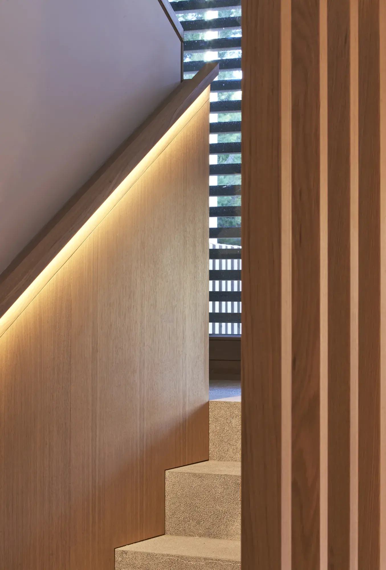 Las fachadas principales a las mejores orientaciones, vistas y jardines están formadas por persianas plegables de lamas horizontales de madera que actúan como filtro solar, creando un juego cambiante de luces y sombras inspirado en las pérgolas y celosías tradicionales mediterráneas, permitiendo regular la privacidad y controlar el...