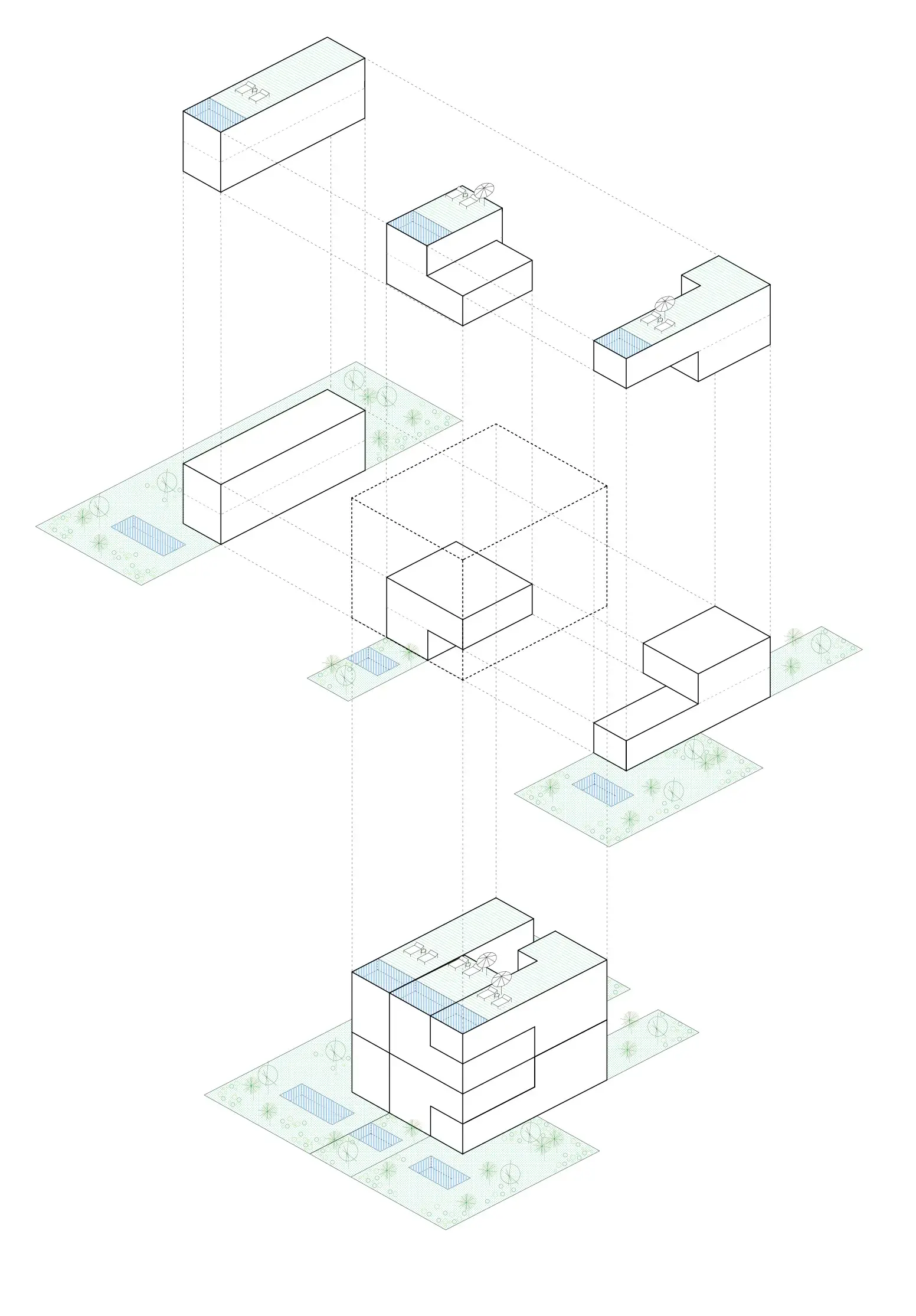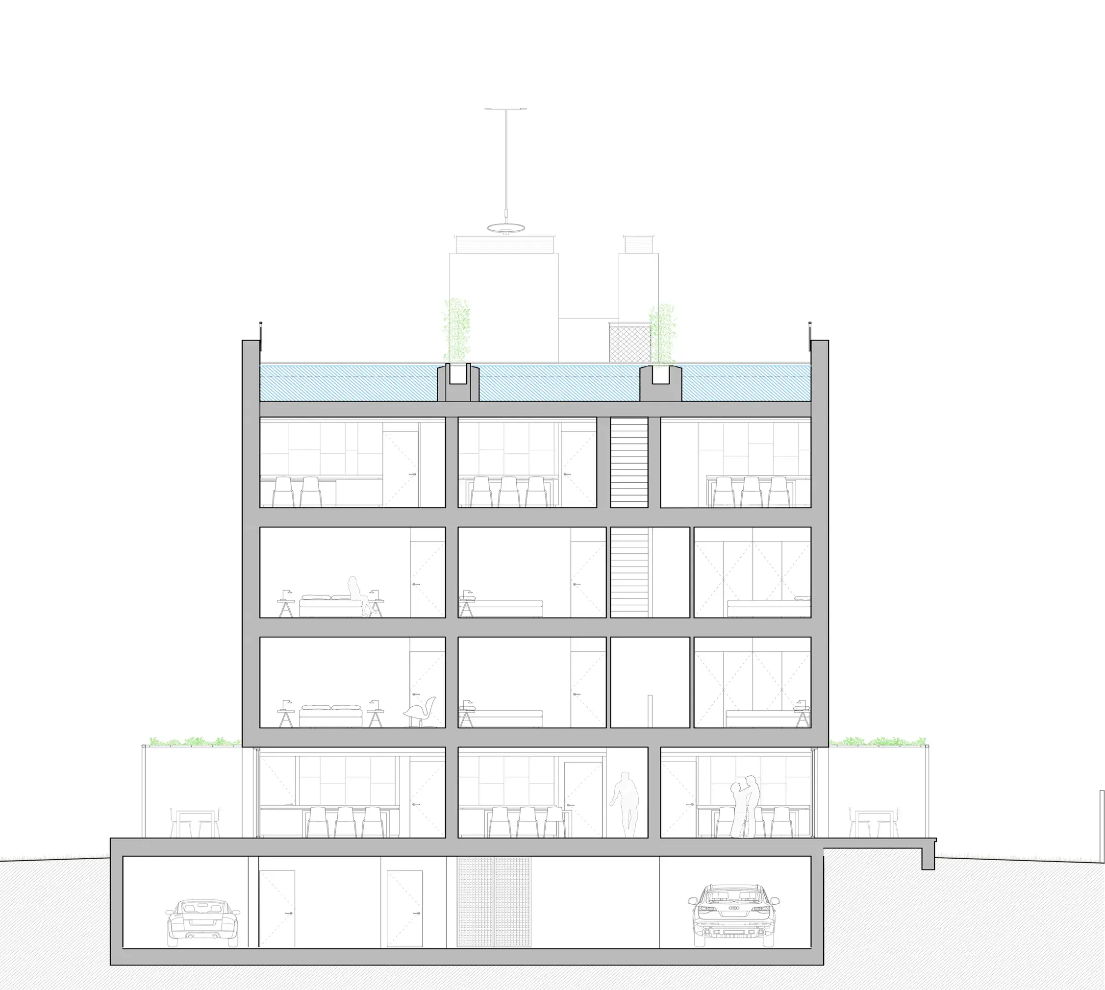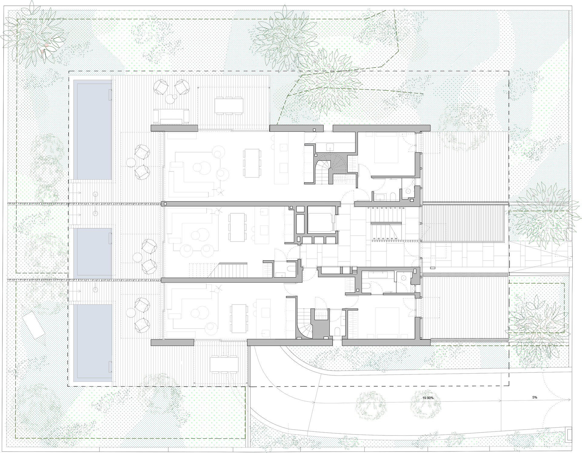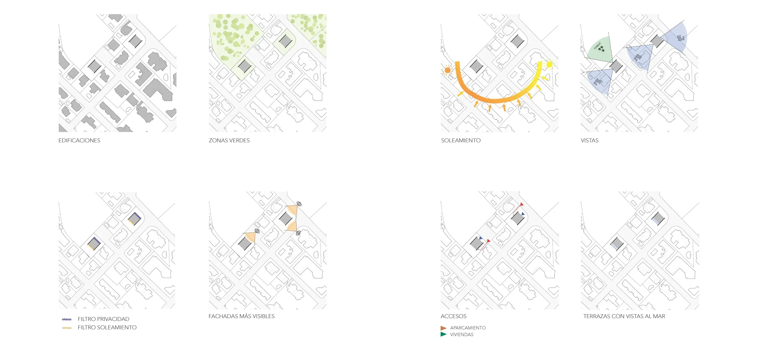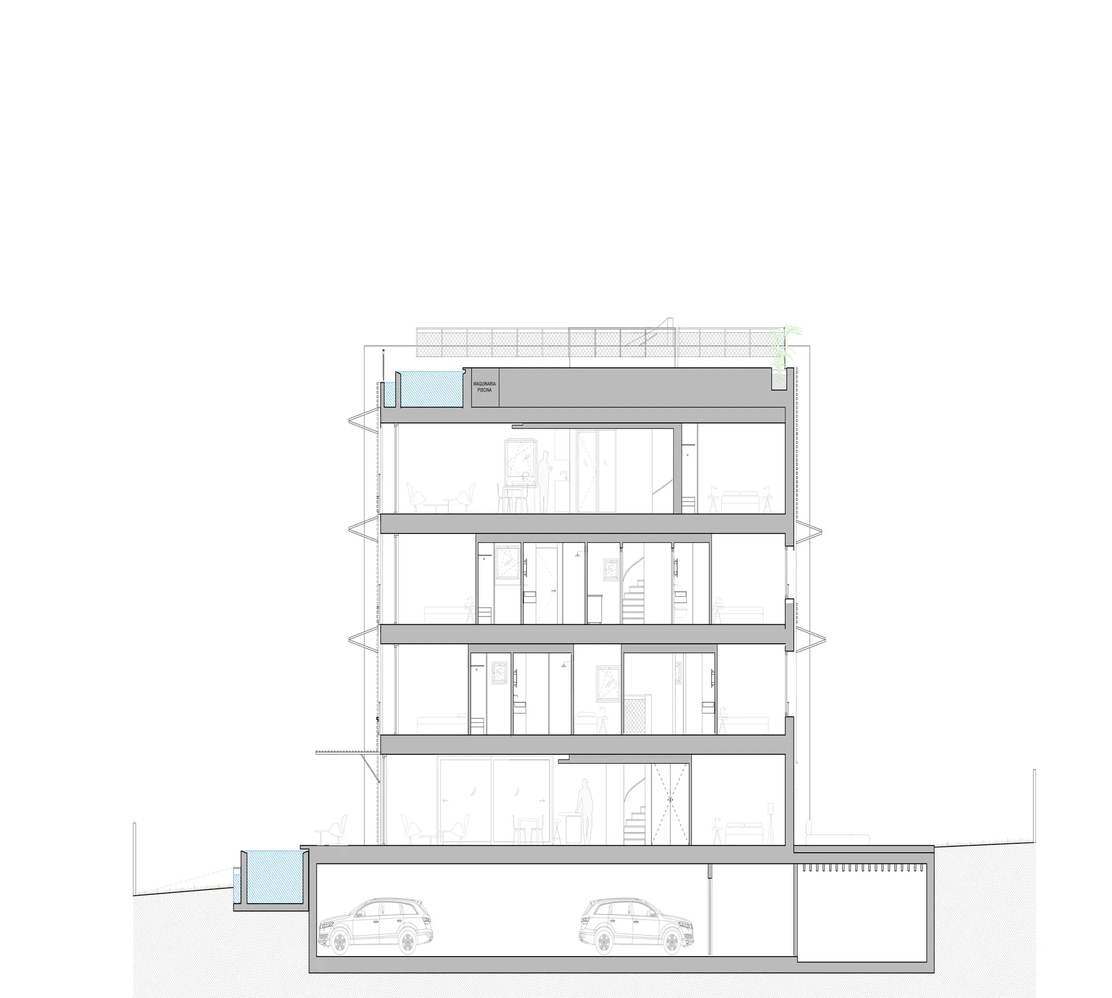 Sacando el máximo partido a la normativa urbanística de pb+3, se han proyectado los edificios para que, a pesar de la densidad y el limitado espacio, cada una de las 12 viviendas pueda disfrutar del ideal suburbano de sostenibilidad, eficiencia energética y privacidad con jardín e incluso piscina privada. De esta forma, todas las viviendas cuentan con su propia piscina privada. Las viviendas, resueltas en duplex, son 6 en planta baja con jardín y piscina y 6 áticos con piscina en la azotea que cuenta con vistas panorámicas hacia a la bahía de palma y también hacia Cala Mayor e Illetas.