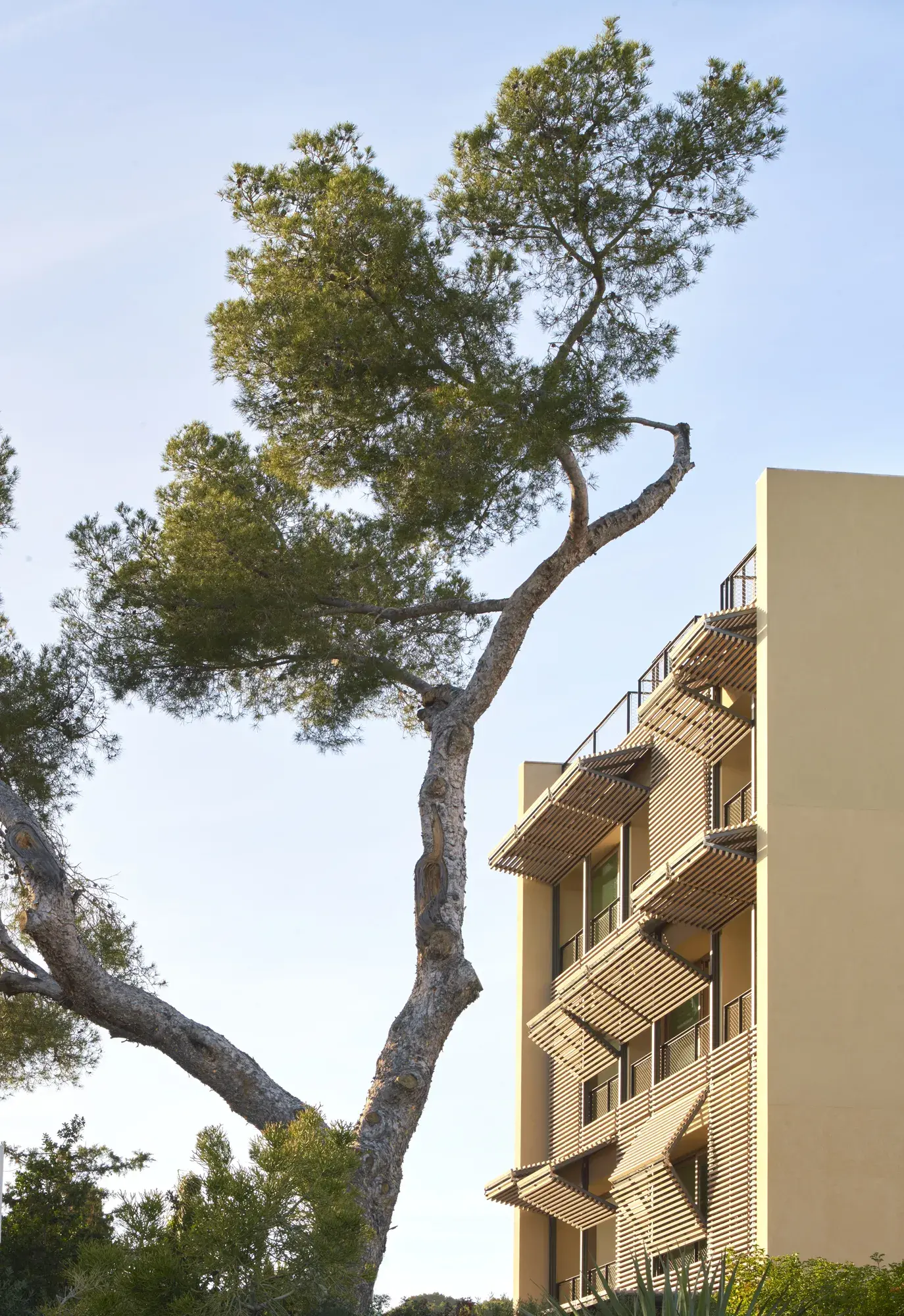 De esta forma se puede aprovechar el sol de invierno y bloquear el sol de verano funcionando como una piel cambiante, orgánica y permeable, reflejo exterior de su vida interior, un filtro solar modulador de luces y sombras, optimizado a partir de los estudios solares, que se adapta a las diferentes necesidades climatológicas y que encuentra sus raíces en la tradición de las pérgolas y persianas mallorquinas, que unido a una ventilación cruzada y un sistema de recuperación de calor es clave para proporcionar una máxima eficiencia energética.