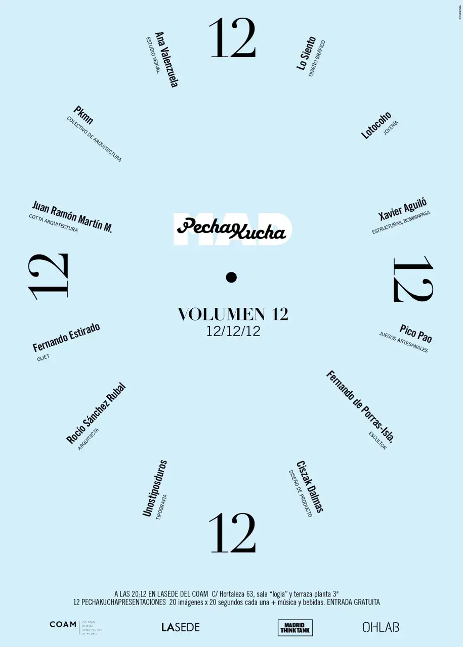 Paloma Hernaiz y Jaime Oliver (OHLAB arquitectura y estrategia urbana, www.ohlab.net) organizan Pecha Kucha Madrid desde el 2007 en diferentes espacios de la ciudad como la galería Off-limits, el Studio Banana, el showroom de moda Union Room, el Centro de Creación Contemporánea Matadero Madrid, Centro HUB Madrid, Centro de Turismo Colón o UTOPIC_US.