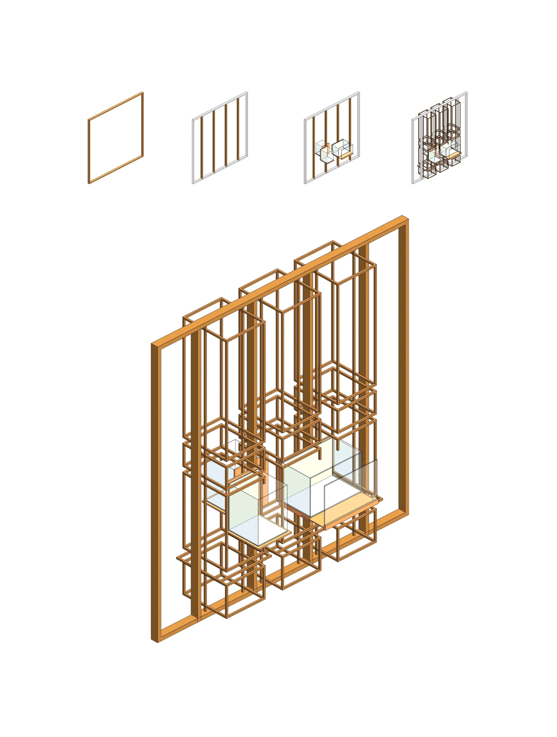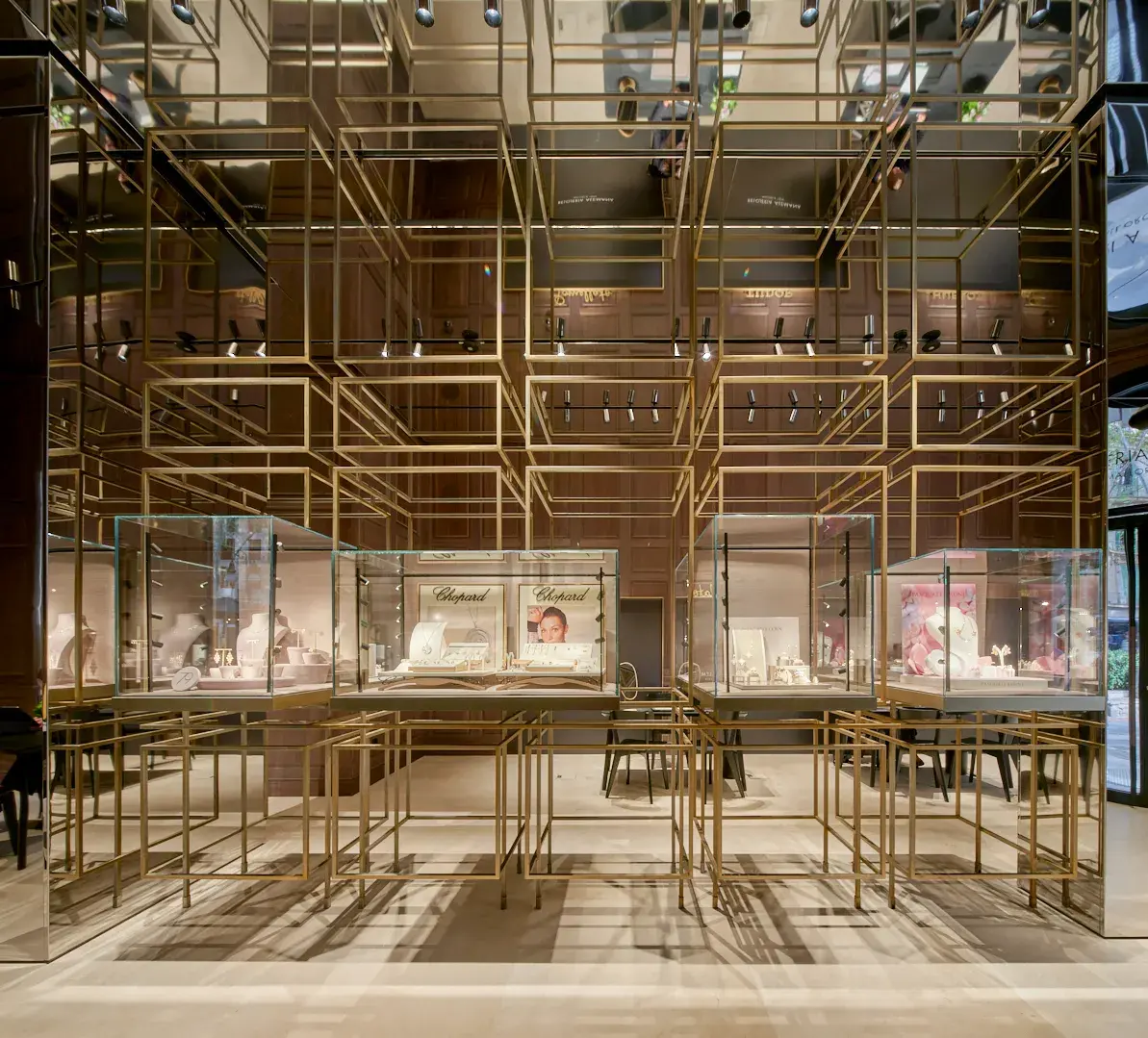 Dentro de este marco se insertan vitrinas de vidrio que parecen flotar en el interior de la retícula metálica. La pieza no es mobiliario ni un simple elemento expositivo; es un dispositivo espacial que organiza la tienda, define la circulación y transforma la exhibición en una experiencia tridimensional.