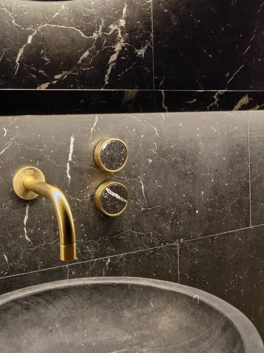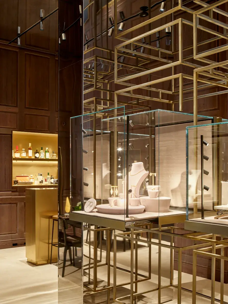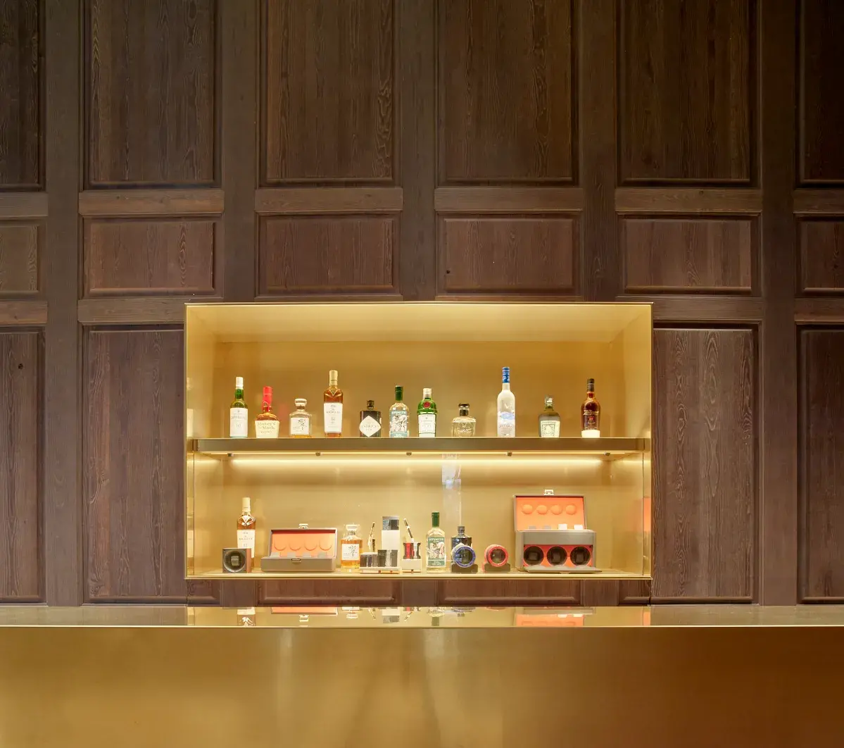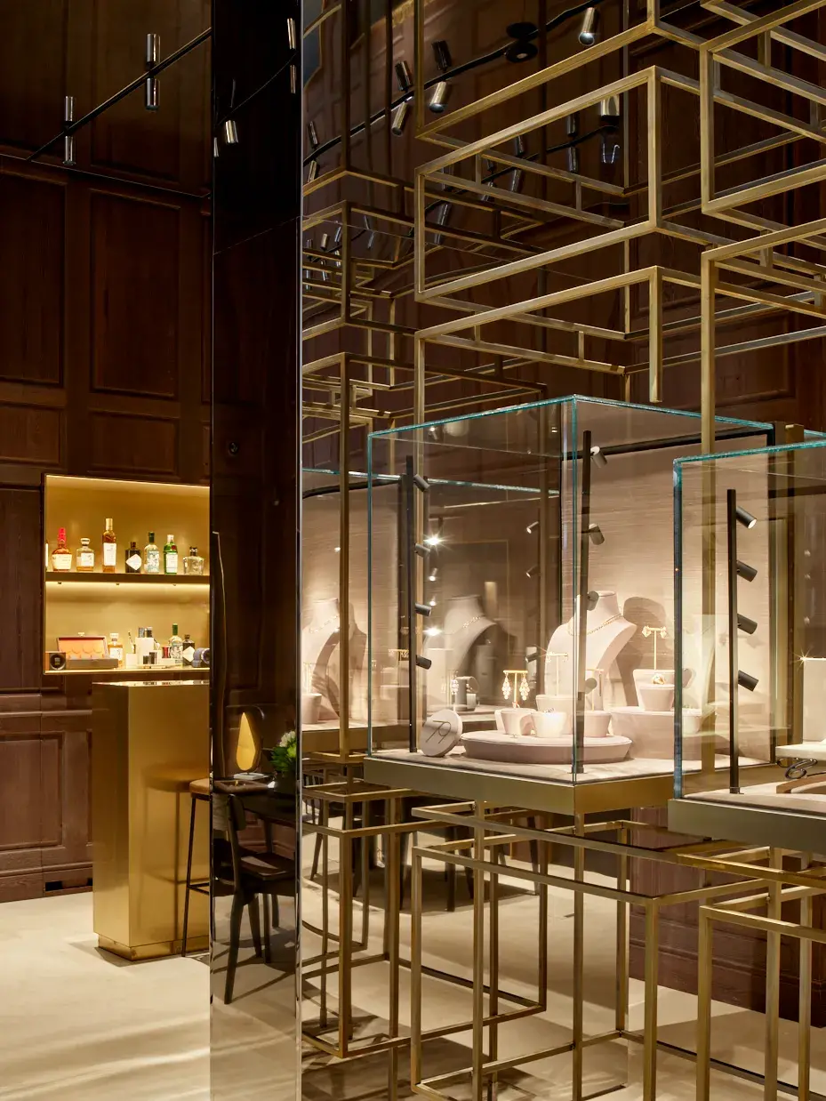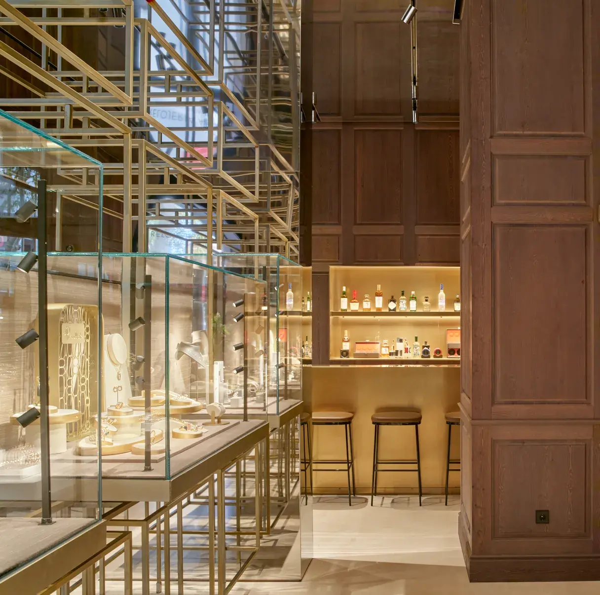 Entre estas incisiones emerge un elemento inesperado: el bar. Concebido como otro corner, está revestido en acero inoxidable con acabado en latón y acompañado por un mostrador frontal monolítico. Aquí, las piezas de relojería dialogan con una selección curada de botellas premium, reforzando la noción de hospitalidad y permanencia. En el retail de lujo contemporáneo, la experiencia trasciende la transacción; se construye a través del tiempo compartido.