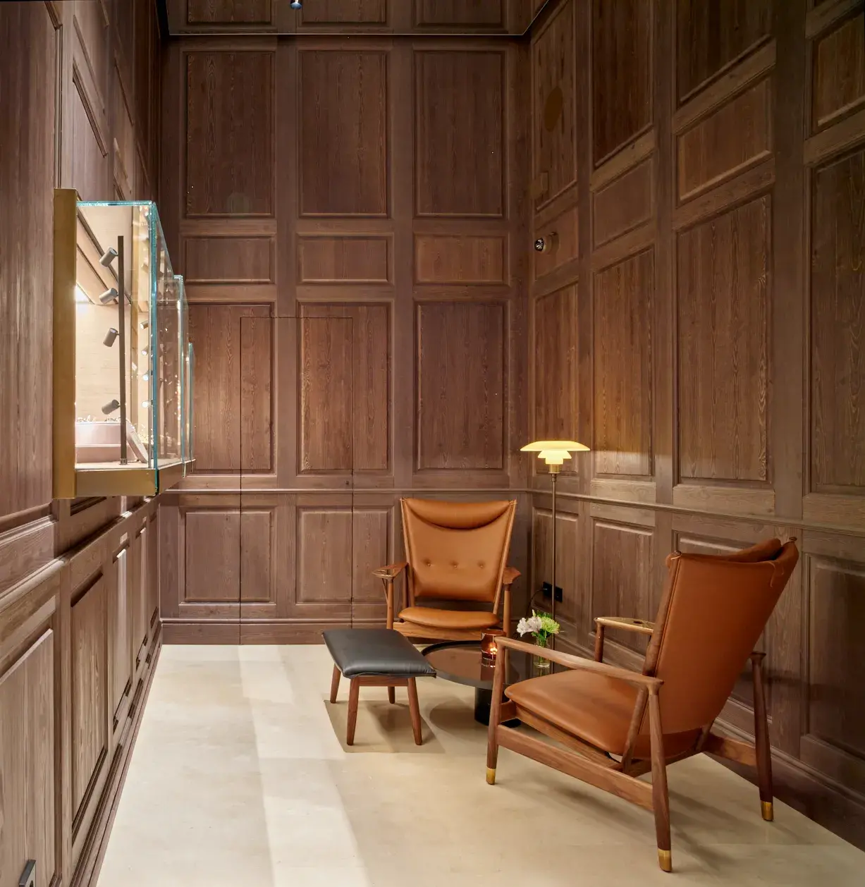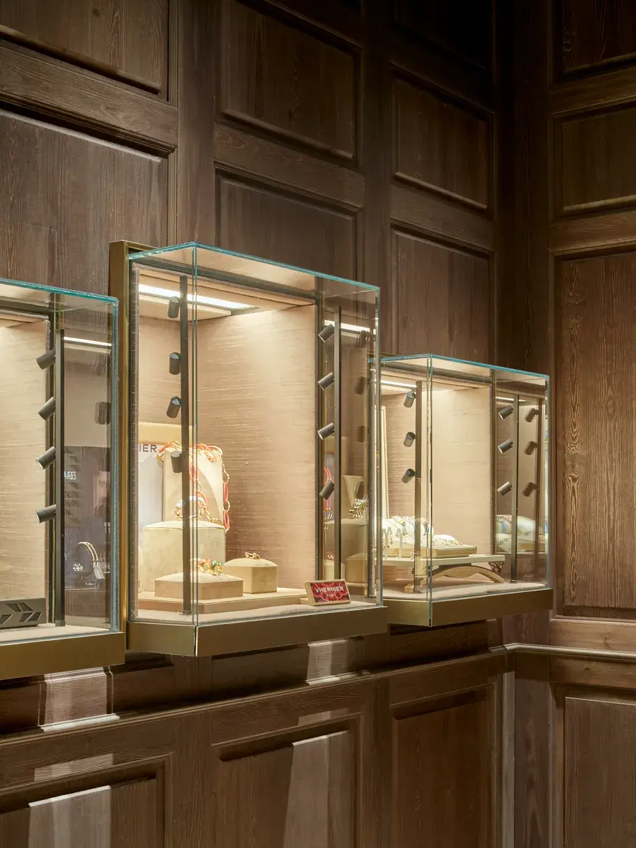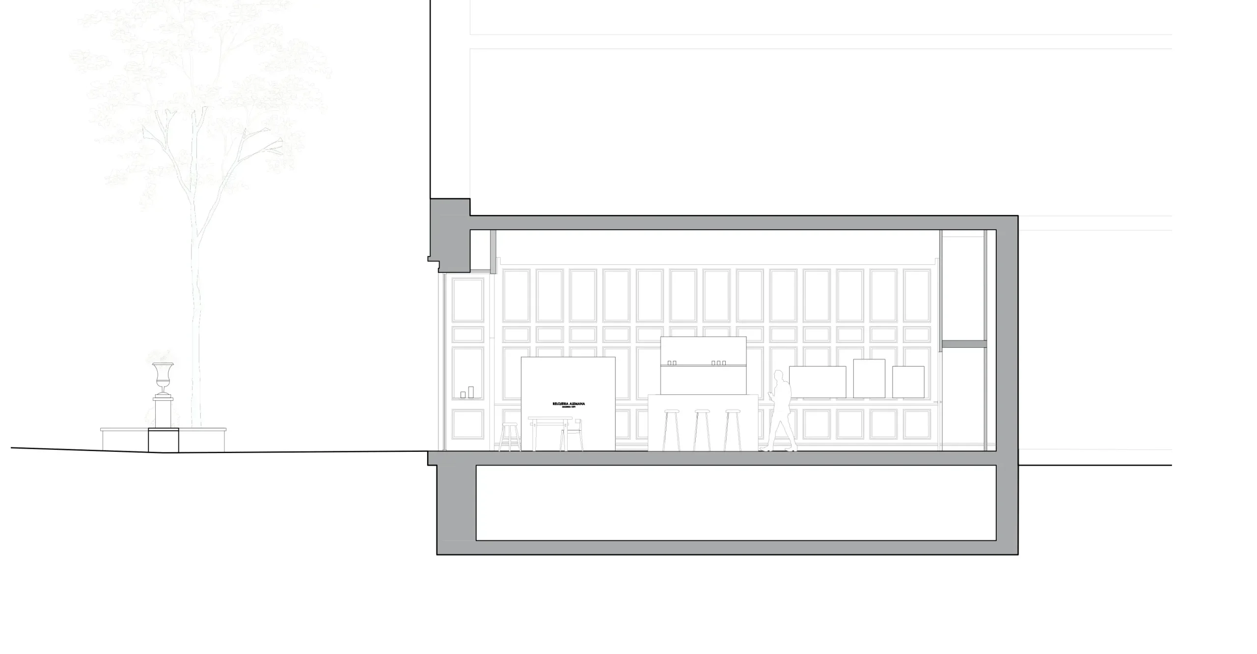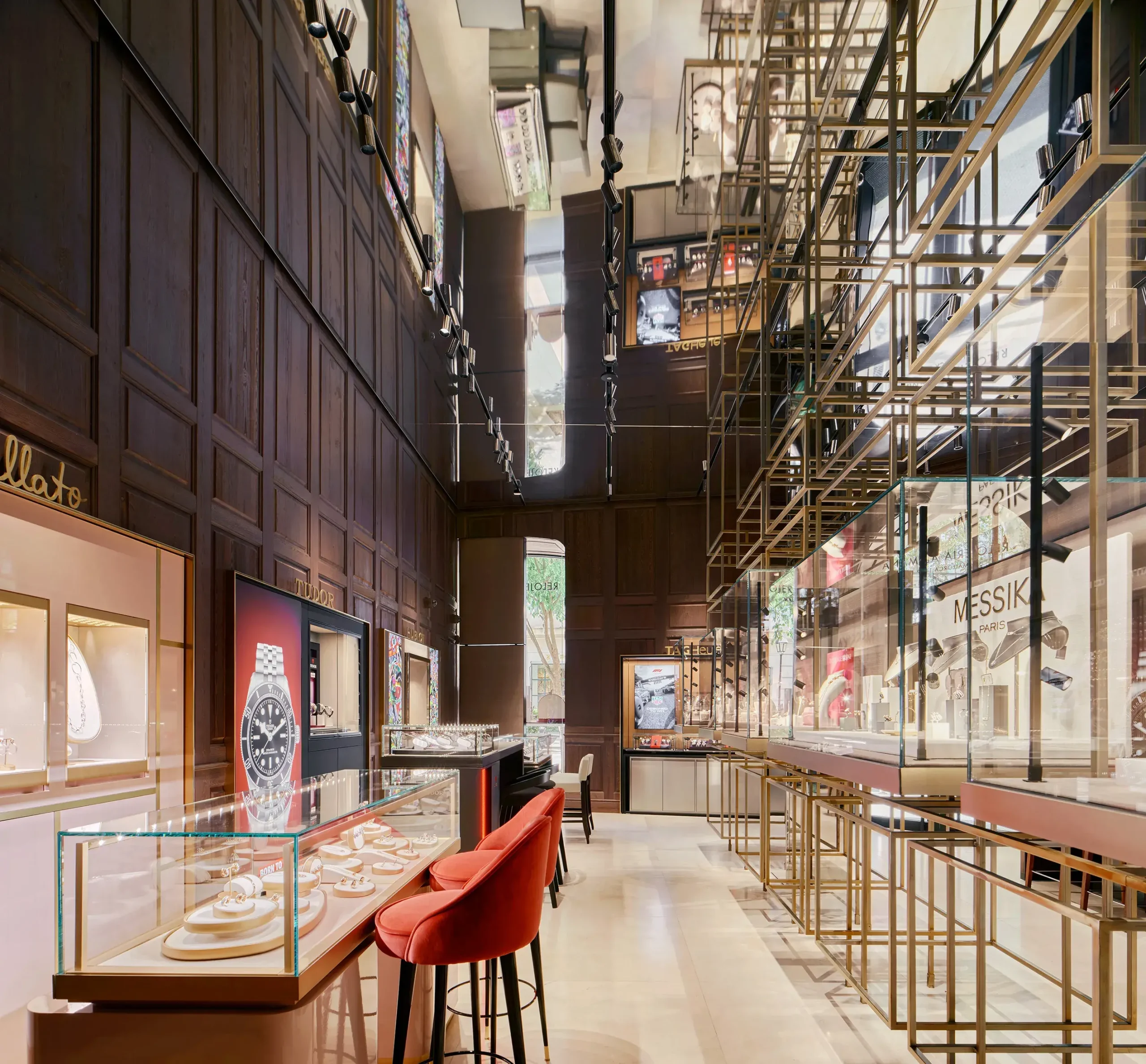 Concebida como un espacio multimarca, la tienda integra corners para Panerai, Omega, Tudor y otras casas internacionales, junto con la colección propia de joyería de Relojería Alemana. Estos espacios se distribuyen a lo largo del perímetro como sutiles incisiones en el panelado, permitiendo que cada marca conserve su identidad sin alterar la unidad arquitectónica del conjunto. El perímetro se convierte así en una partitura continua en la que cada inserción introduce una variación dentro de una gramática espacial compartida.