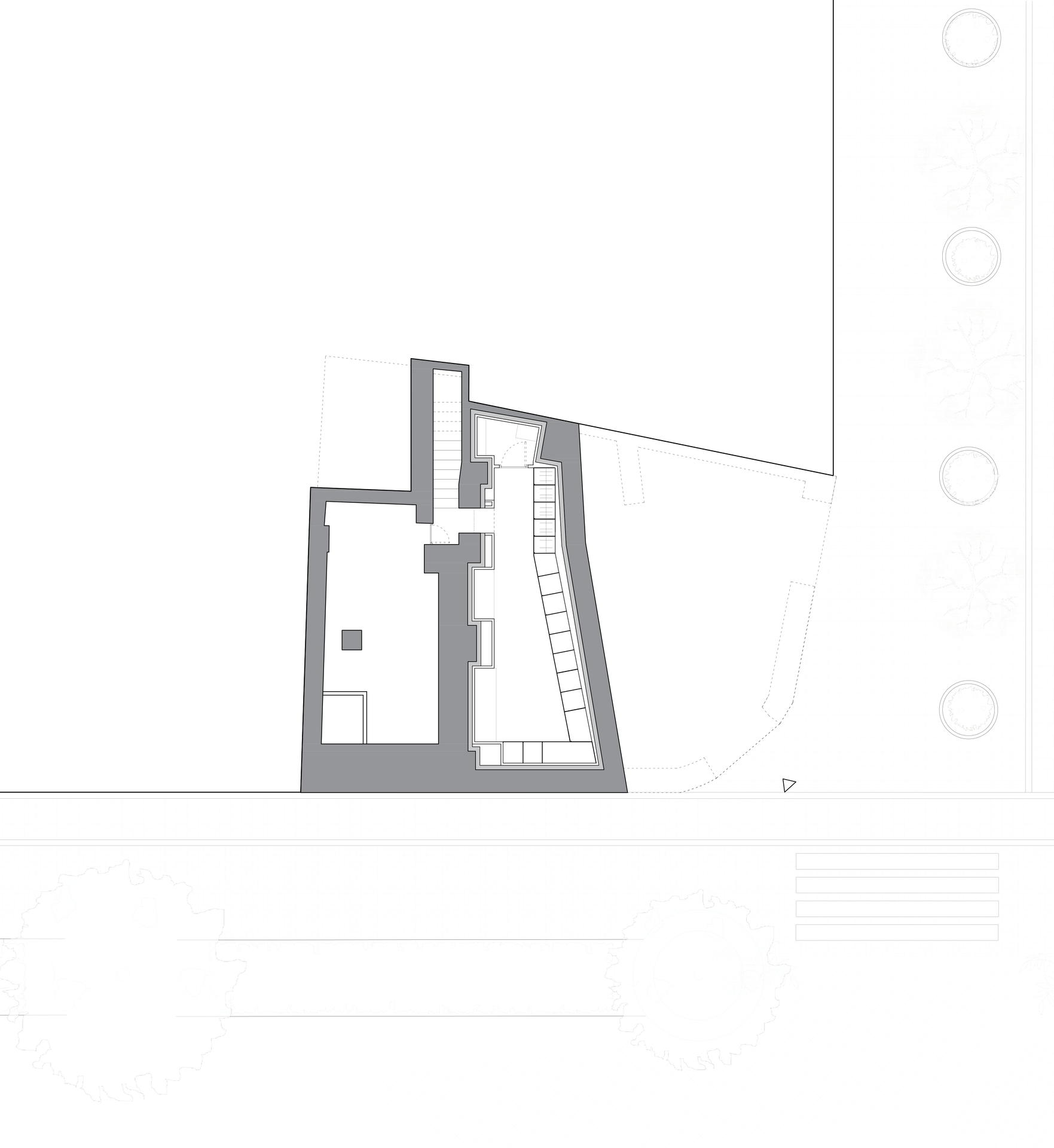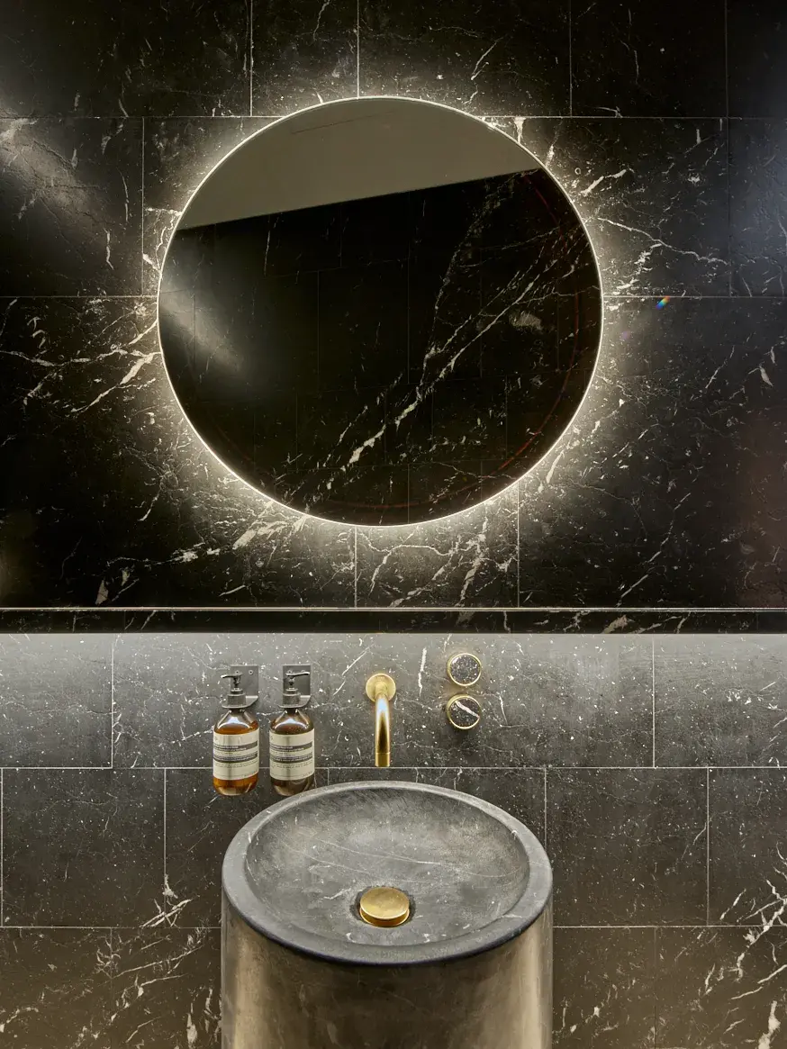 Hacia la parte posterior del espacio, una zona más reservada ofrece un ambiente íntimo para consultas privadas y ventas especiales. El proyecto se completa con un aseo para clientes acabado en mármol negro, almacén y caja fuerte de seguridad en el sótano, y un área de back-office en la entreplanta.