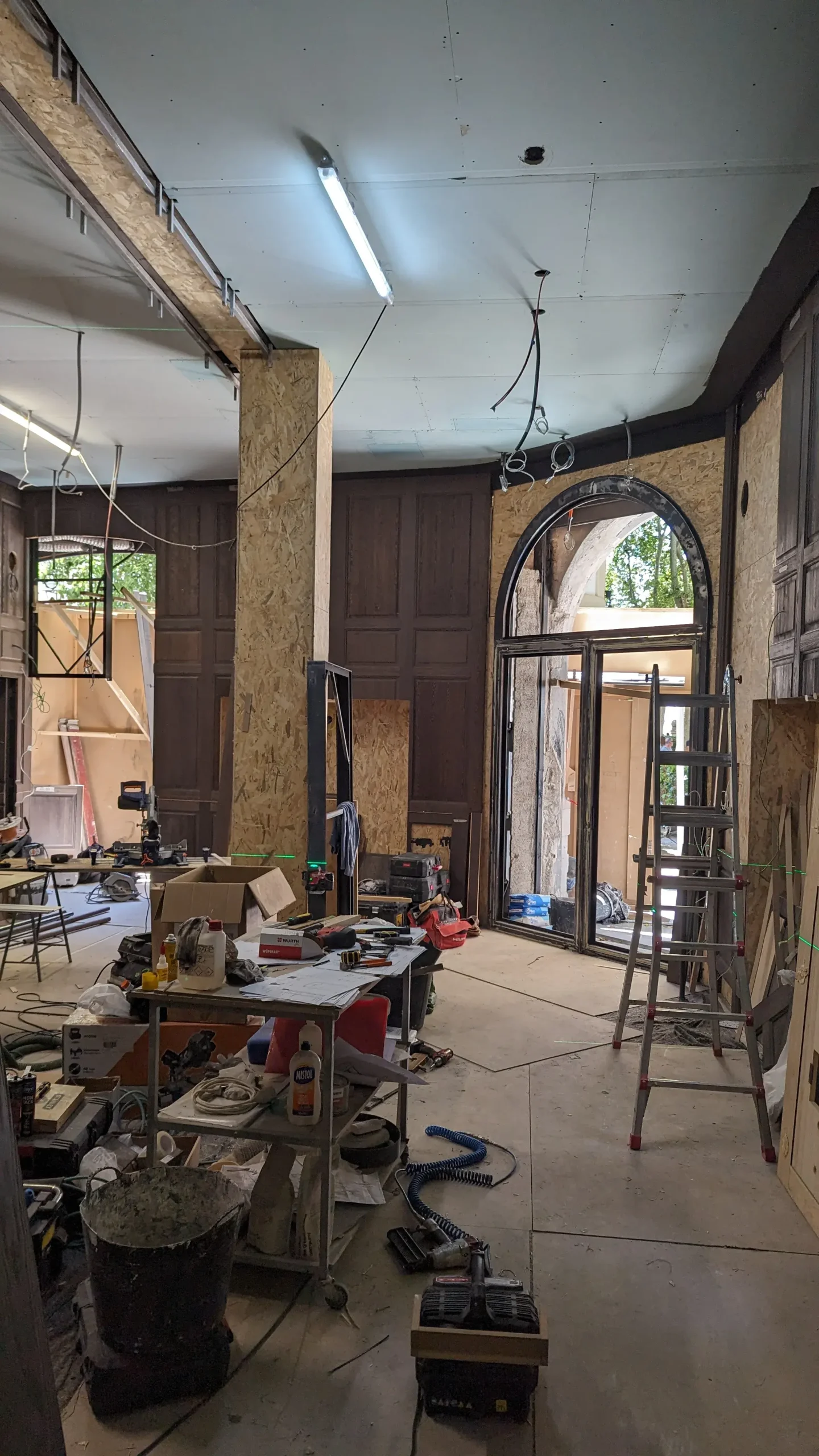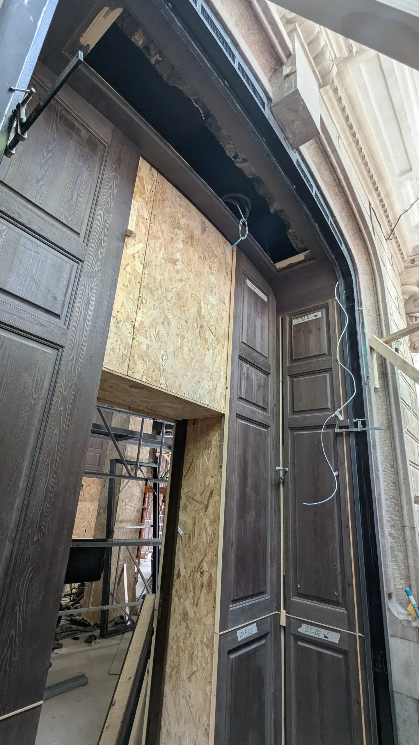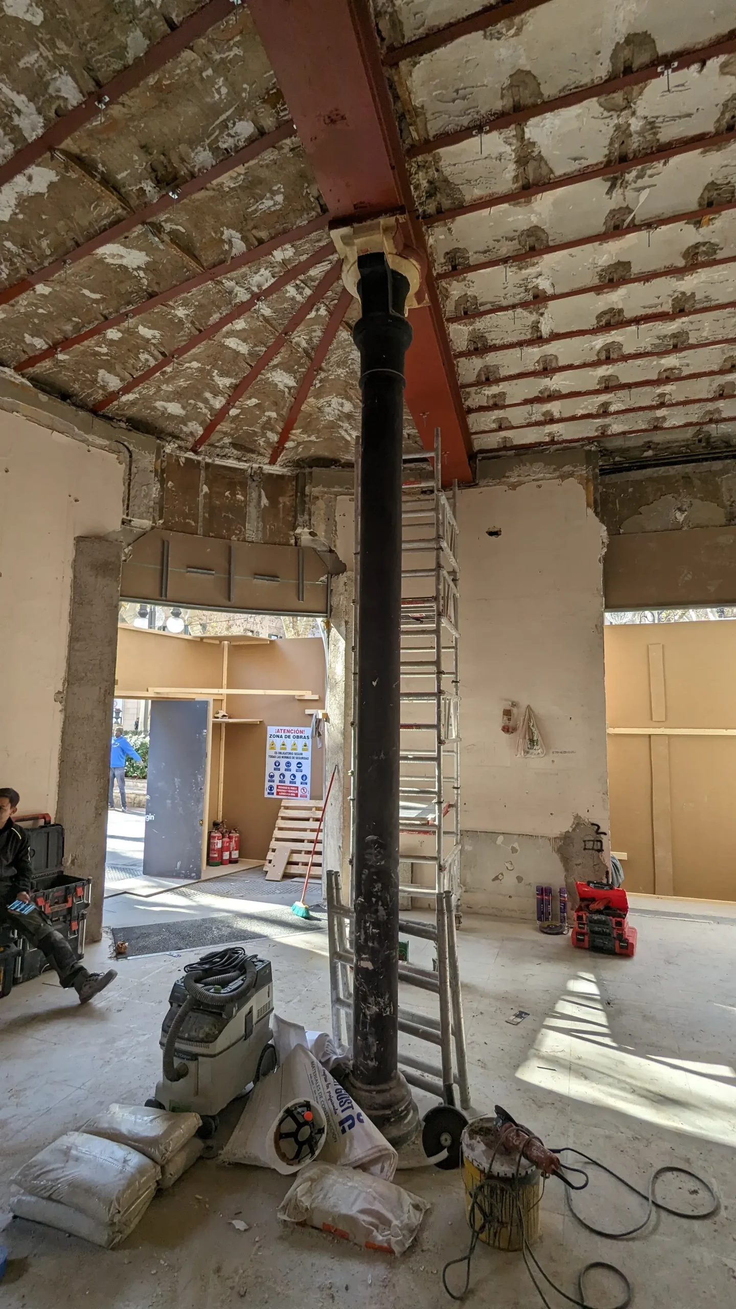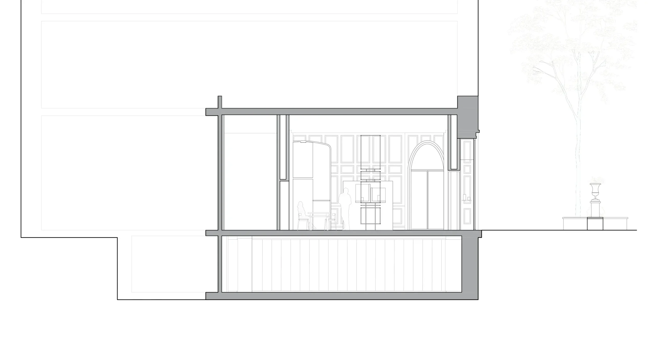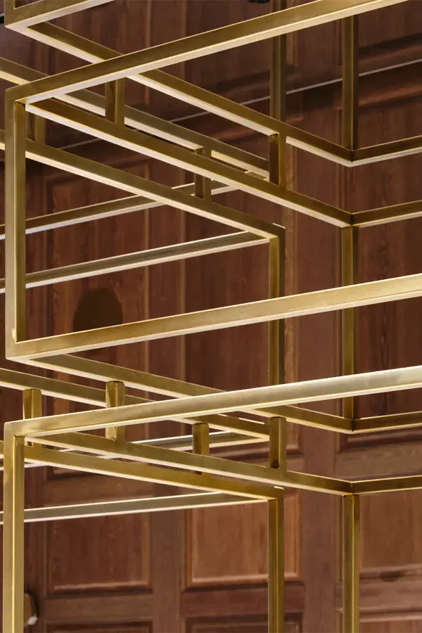 Sin embargo, la intervención va más allá de una restauración estilística. El gesto central consiste en “radiografiar” este lenguaje clásico —extraer su estructura, deconstruir sus molduras, conservar su esencia—. El resultado es una pieza escultórica situada en el centro del espacio: una estructura tridimensional de latón que opera como una versión abstracta y contemporánea del histórico panelado. Una suerte de esqueleto ornamental que traduce la decoración en estructura.