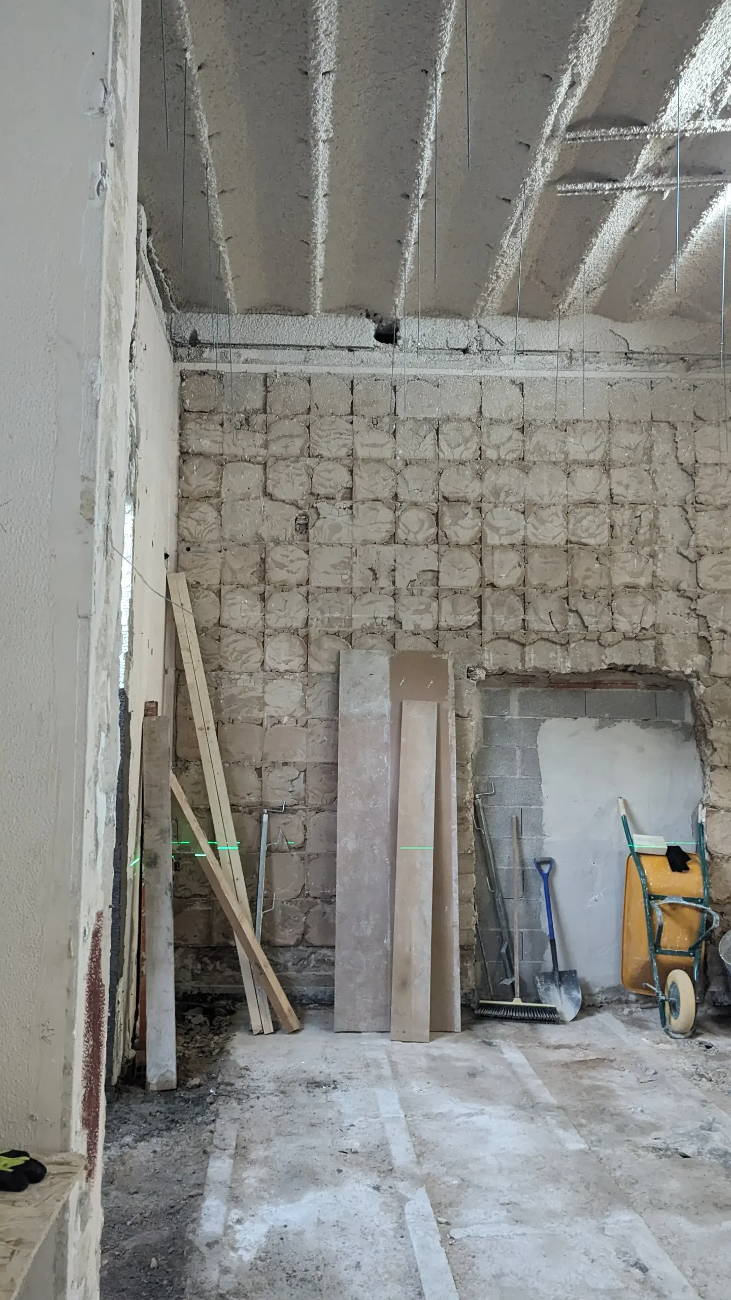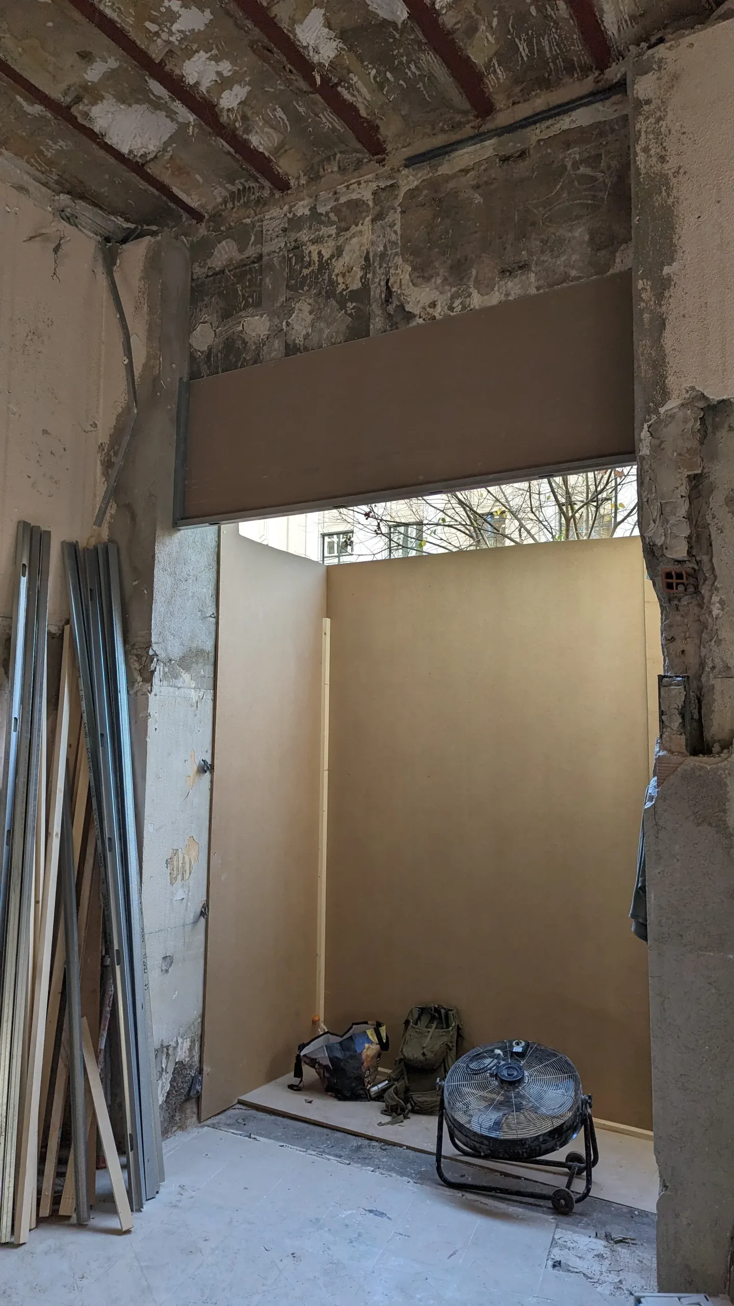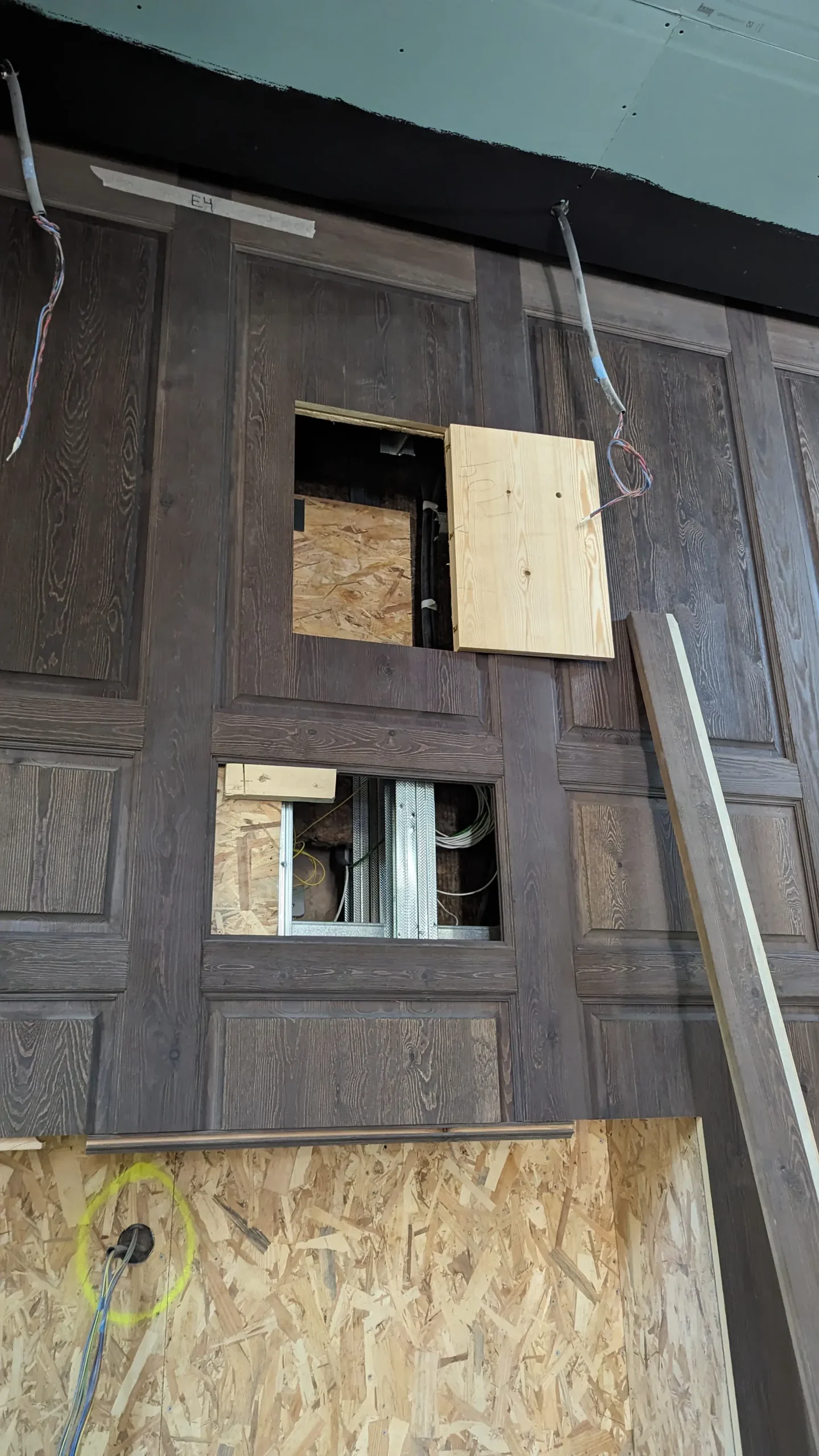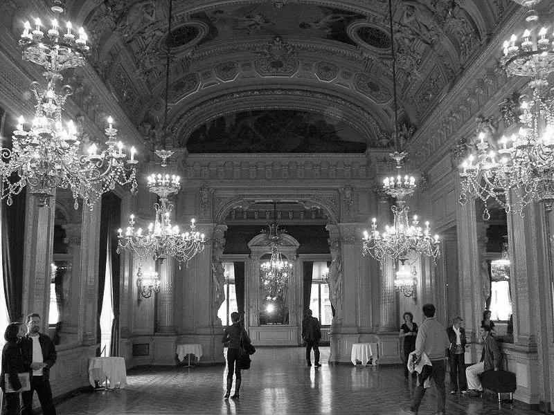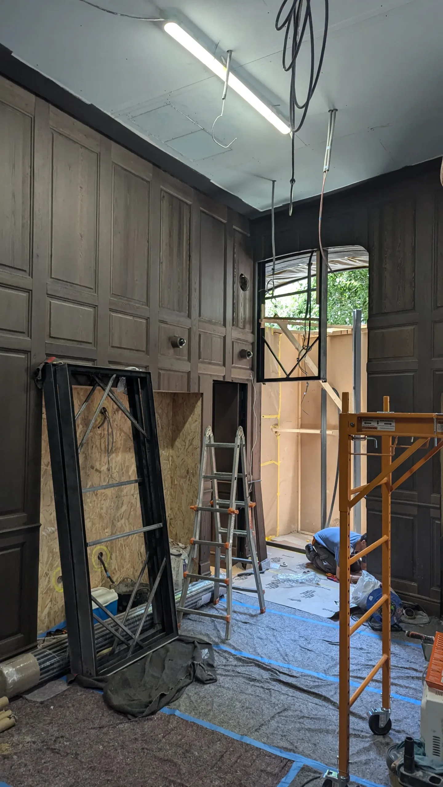 Sin embargo, la intervención va más allá de una restauración estilística. El gesto central consiste en “radiografiar” este lenguaje clásico —extraer su estructura, deconstruir sus molduras, conservar su esencia—. El resultado es una pieza escultórica situada en el centro del espacio: una estructura tridimensional de latón que opera como una versión abstracta y contemporánea del histórico panelado. Una suerte de esqueleto ornamental que traduce la decoración en estructura.