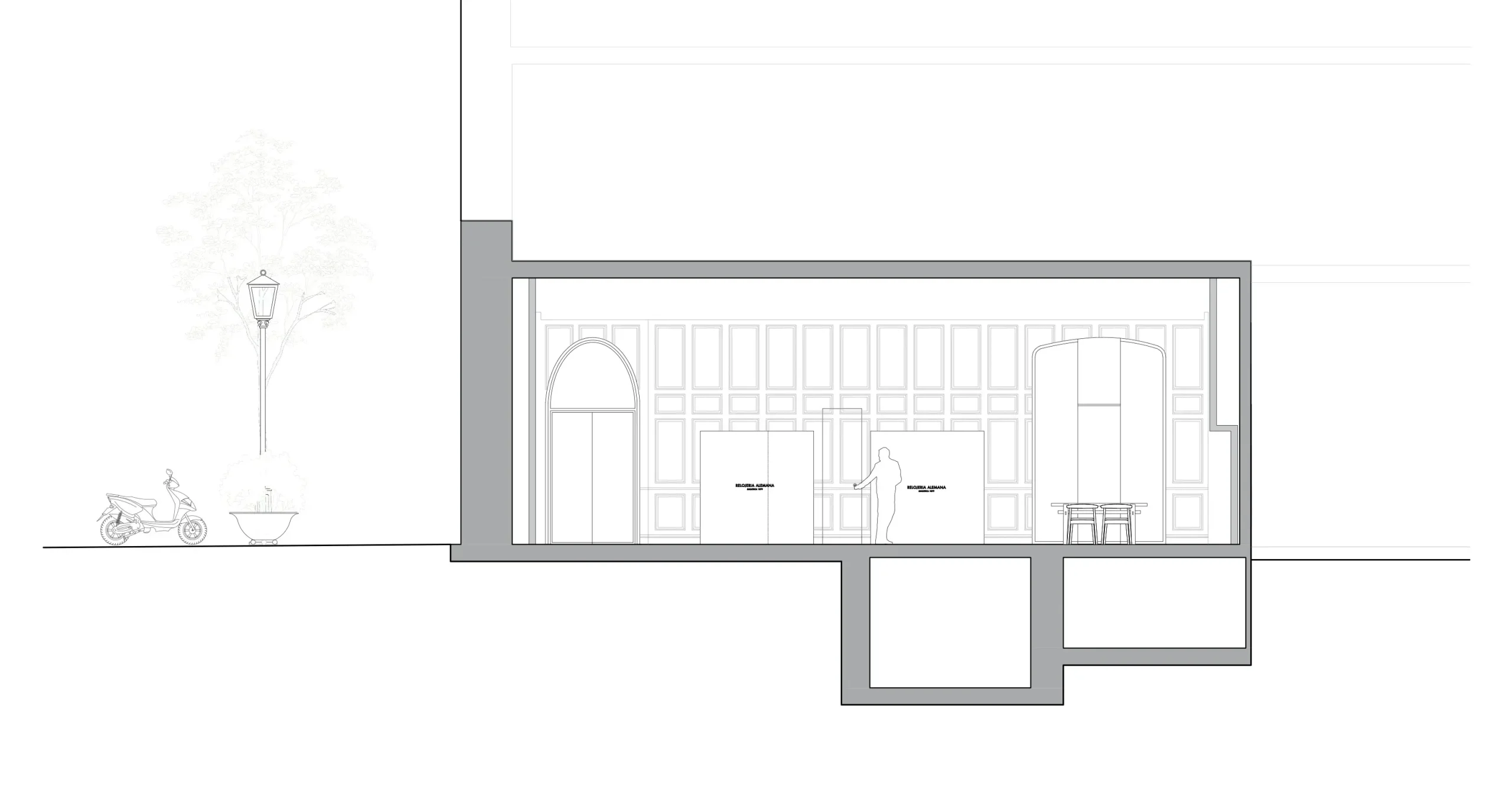 El punto de partida es la clásica boiserie de madera que históricamente ha definido la identidad espacial de Relojería Alemana, así como la de las tradicionales boutiques europeas de relojería. En lugar de replicarla literalmente, el proyecto la recupera y la reinterpreta. El perímetro de la tienda se reviste íntegramente con panelado de madera oscura que evoca esta tradición —proporción, ritmo, molduras, verticalidad— estableciendo una atmósfera densa, íntima y atemporal.