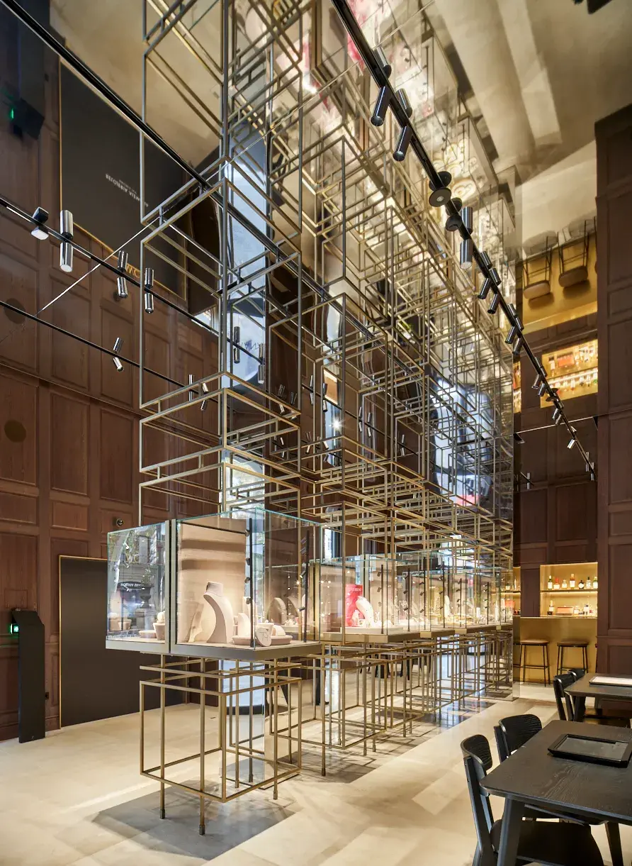 Dentro de este marco se insertan vitrinas de vidrio que parecen flotar en el interior de la retícula metálica. La pieza no es mobiliario ni un simple elemento expositivo; es un dispositivo espacial que organiza la tienda, define la circulación y transforma la exhibición en una experiencia tridimensional.