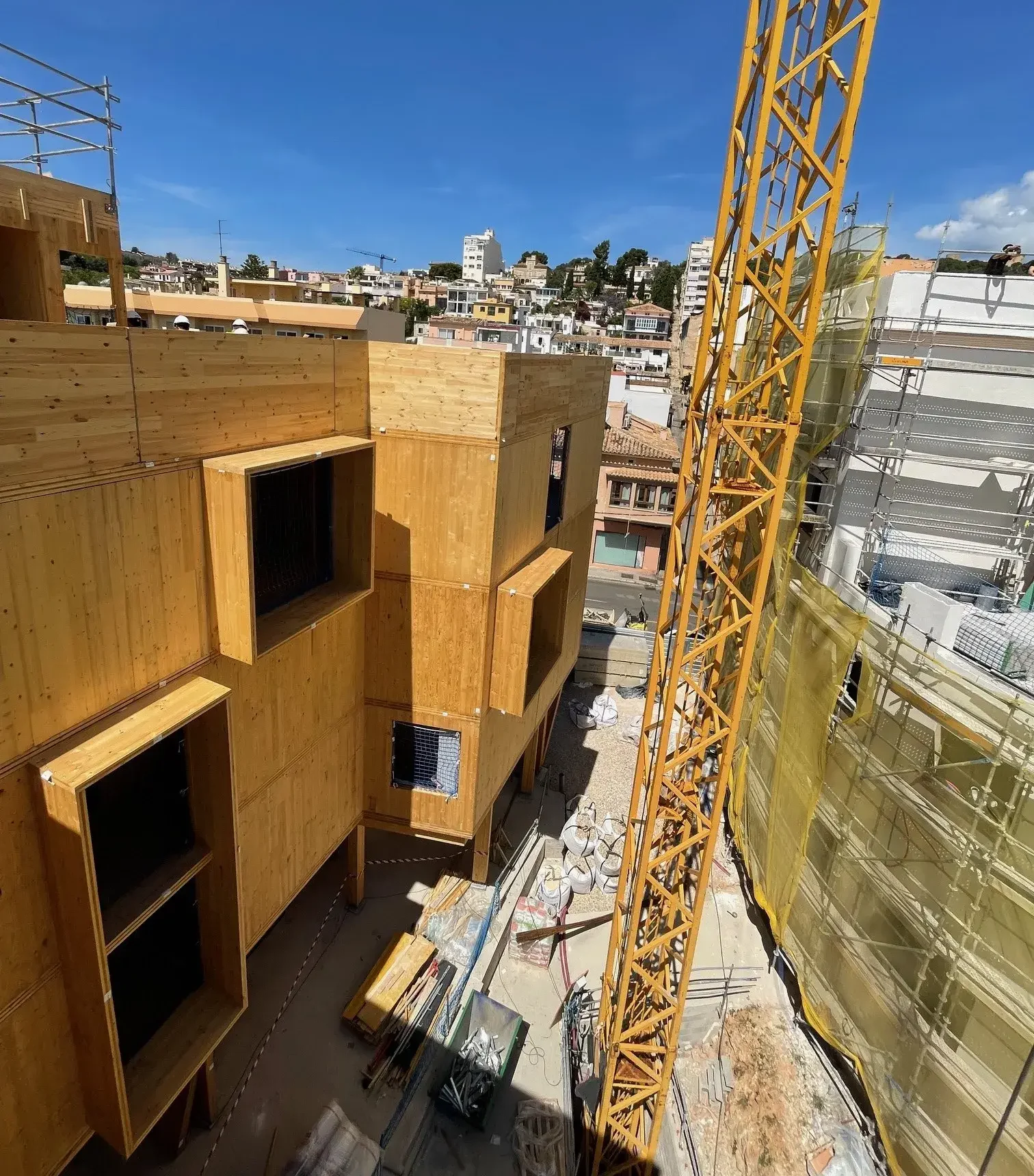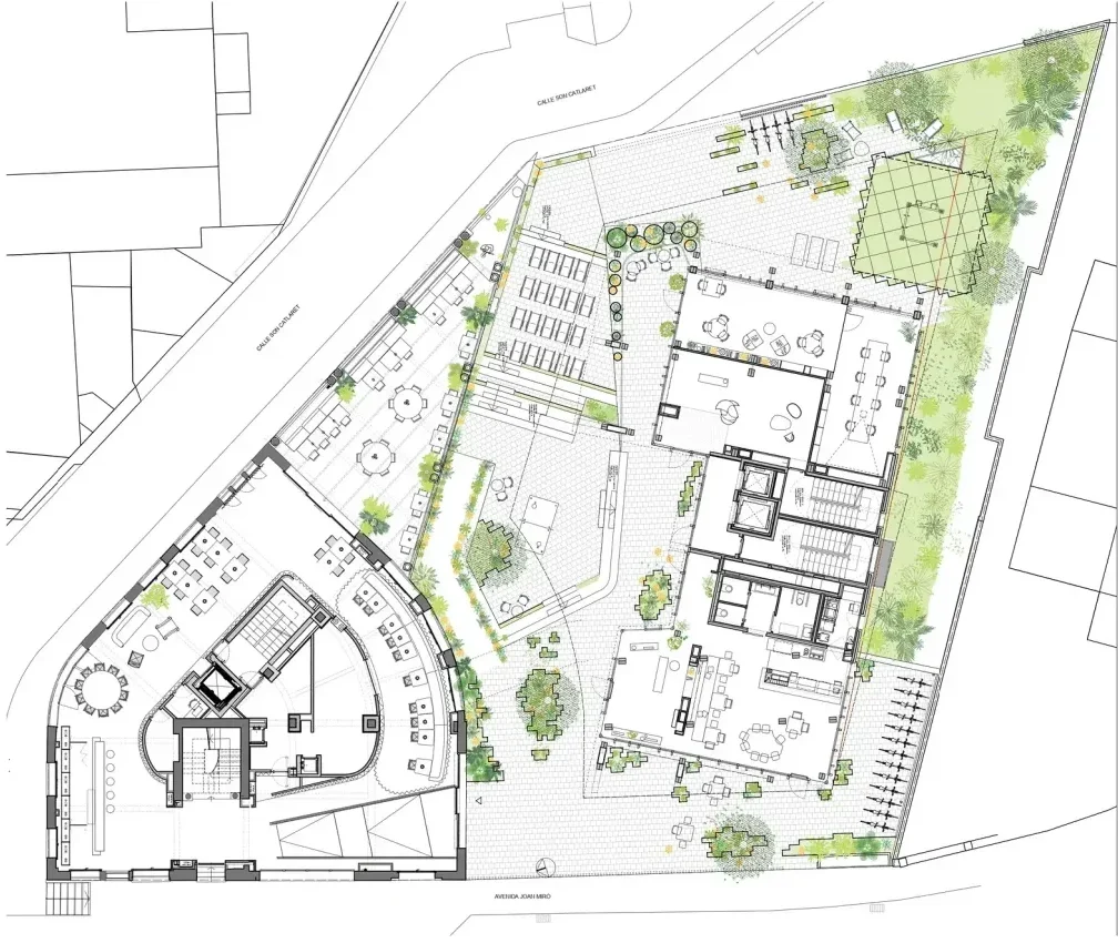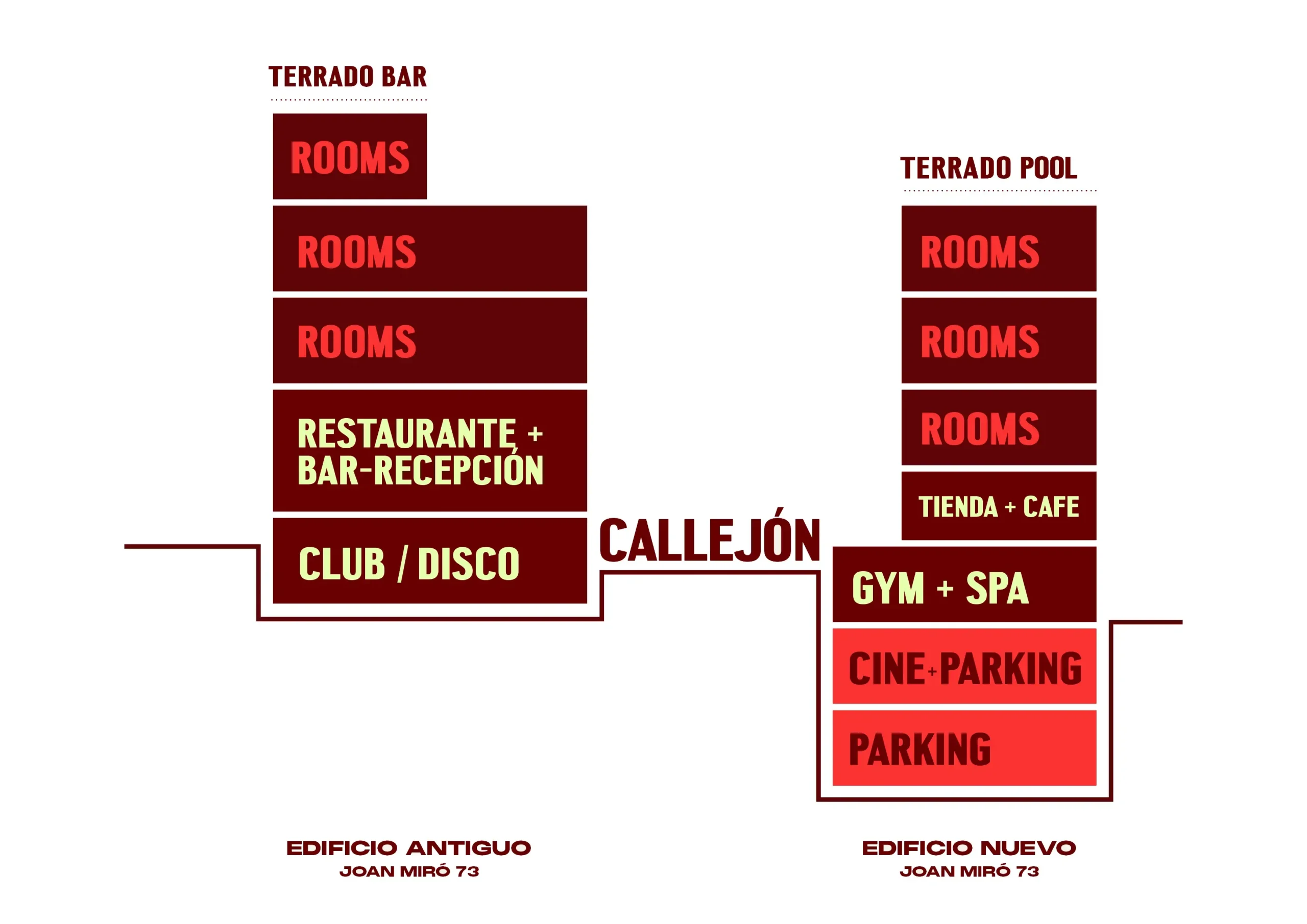 Terreno Barrio Hotel es un hotel urbano de 41 habitaciones situado en El Terreno, en el eje de Joan Miró, y construido a partir de una condición poco habitual: dos piezas radicalmente distintas que se necesitan mutuamente. Por un lado, un edificio protegido de 1935 (Francesc Casas), un híbrido entre regionalismo y racionalismo, atravesado por intervenciones estructurales tardías —toscas, pero eficaces— que hoy forman parte de su biografía. Por otro, una parcela que permite levantar un edificio nuevo de siete plantas, concebido como contrapunto contemporáneo: una estructura de madera CLT diseñada bajo criterios estrictos Passive House (no certificado) y con certificación LEED Platinum