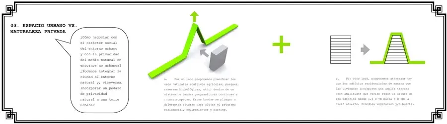 ESPACIO URBANO VS. NATURALEZA PRIVADA: Cómo negociar con el carácter social del entorno urbano y con la privacidad del medio natural en entornos no urbanos? Podemos integrar la ciudad al entorno natural y, viceversa, incorporar un pedazo de privacidad natural a una torre urbana?